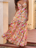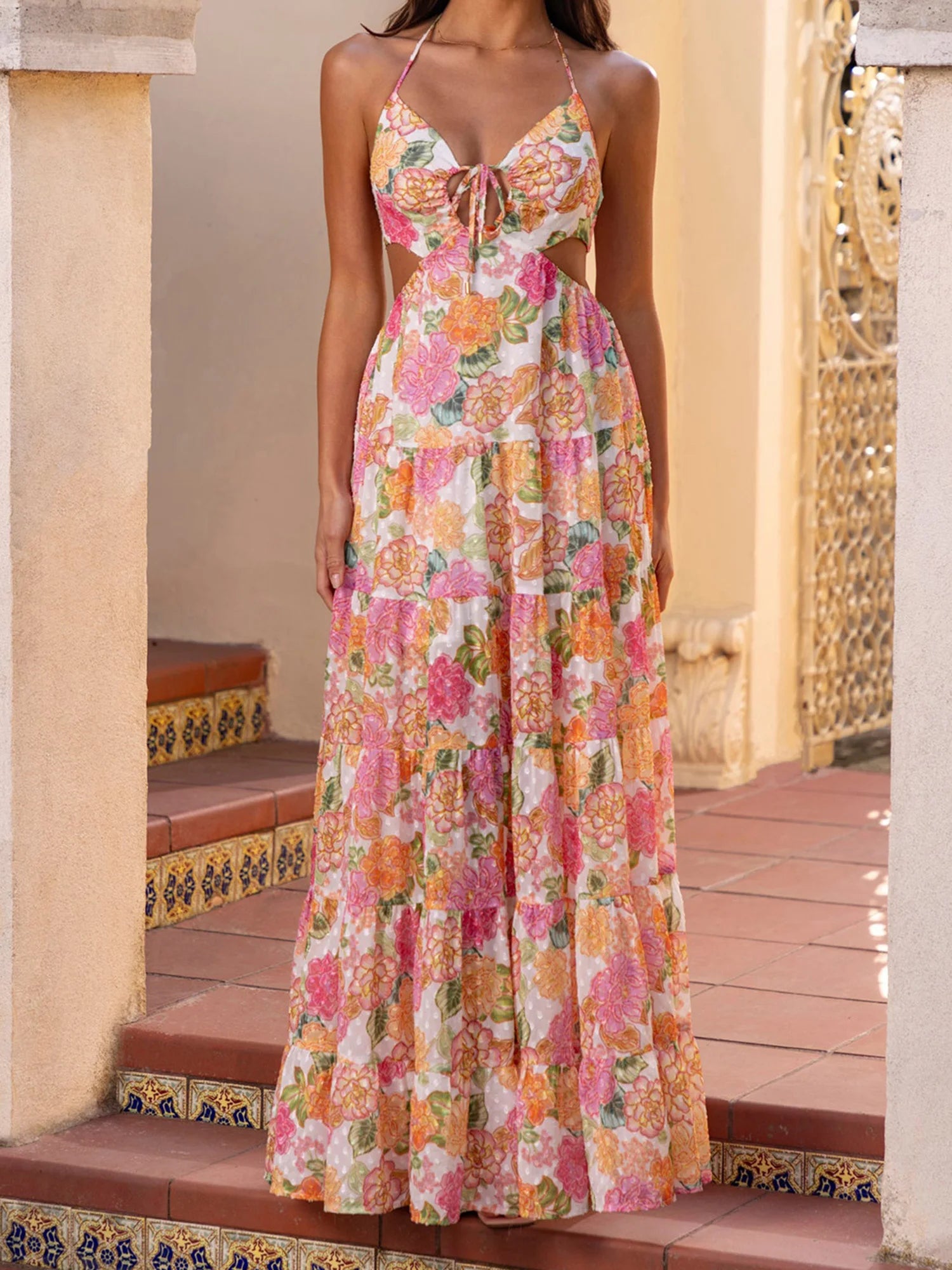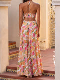 Women Long Dress Floral Print Tie-Up Halter Neck Backless Dress Summer Fashion Sleeveless Casual DressSize (cm)