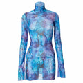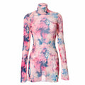 Ladies Mesh Printed Round Neck Bell Sleeve Side Open Hip Dress