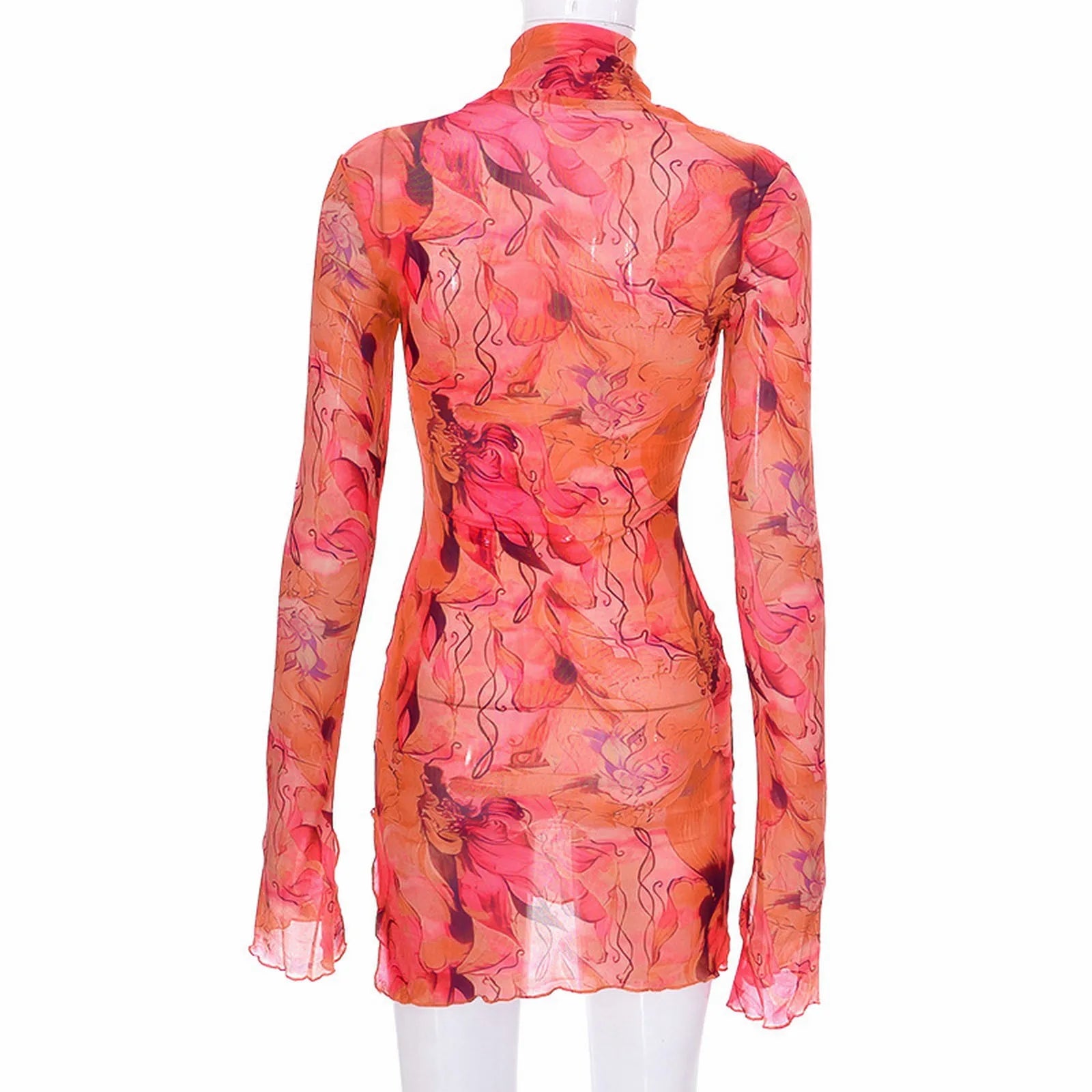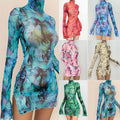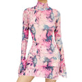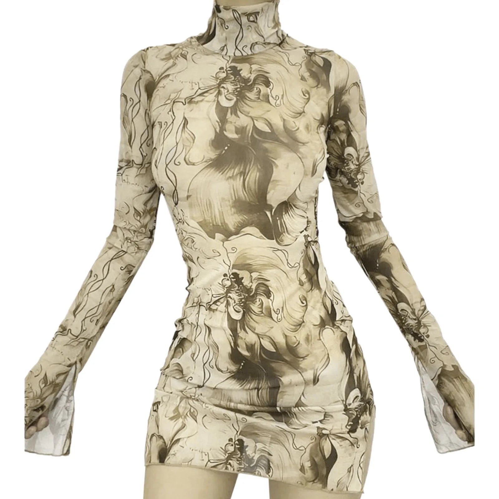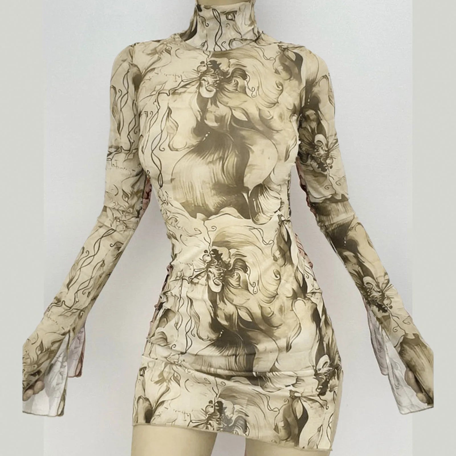 Ladies Mesh Printed Y2k Vintage Dress High Street Slim Elastic Bodycon Party Dress Round Neck Bell Sleeve Side Open Hip Dresses