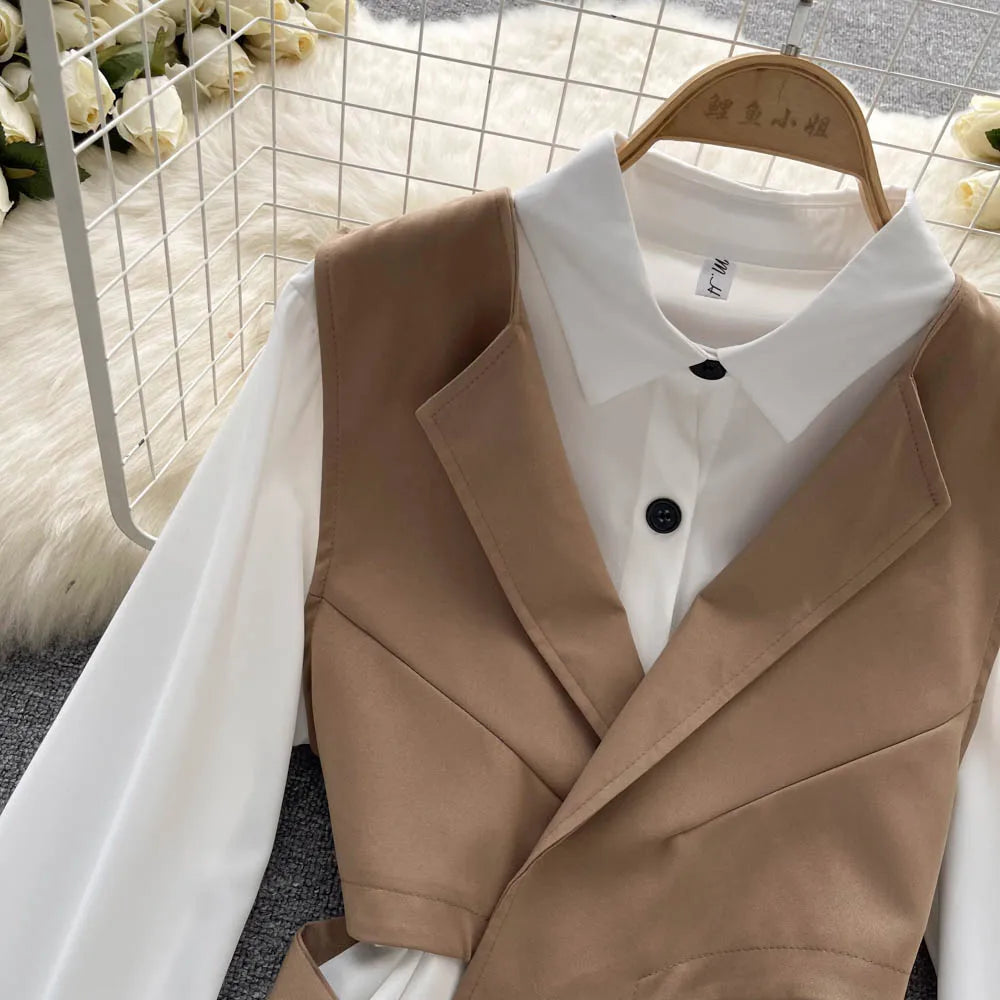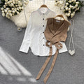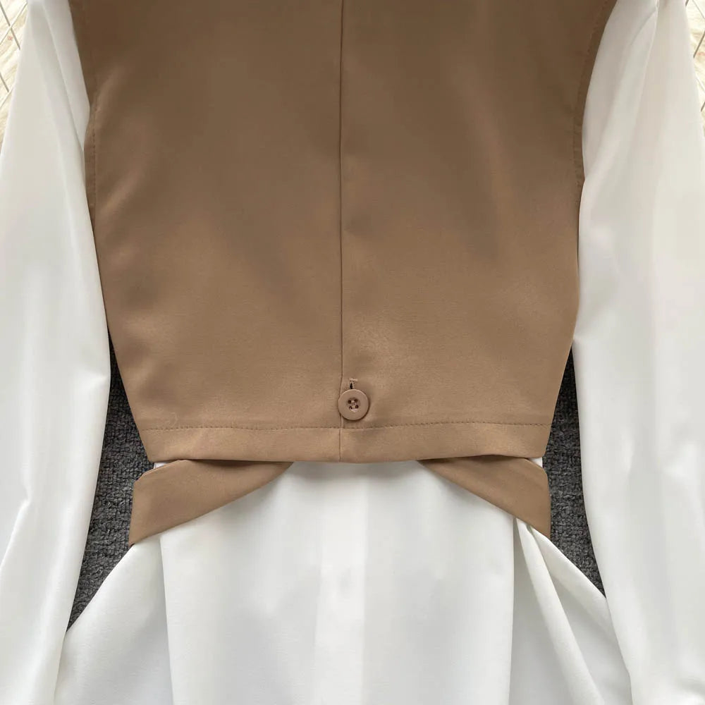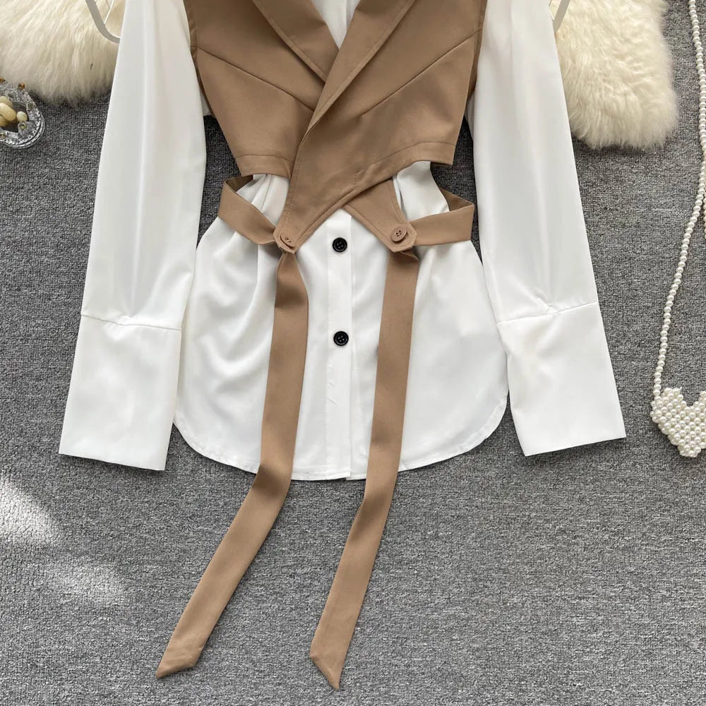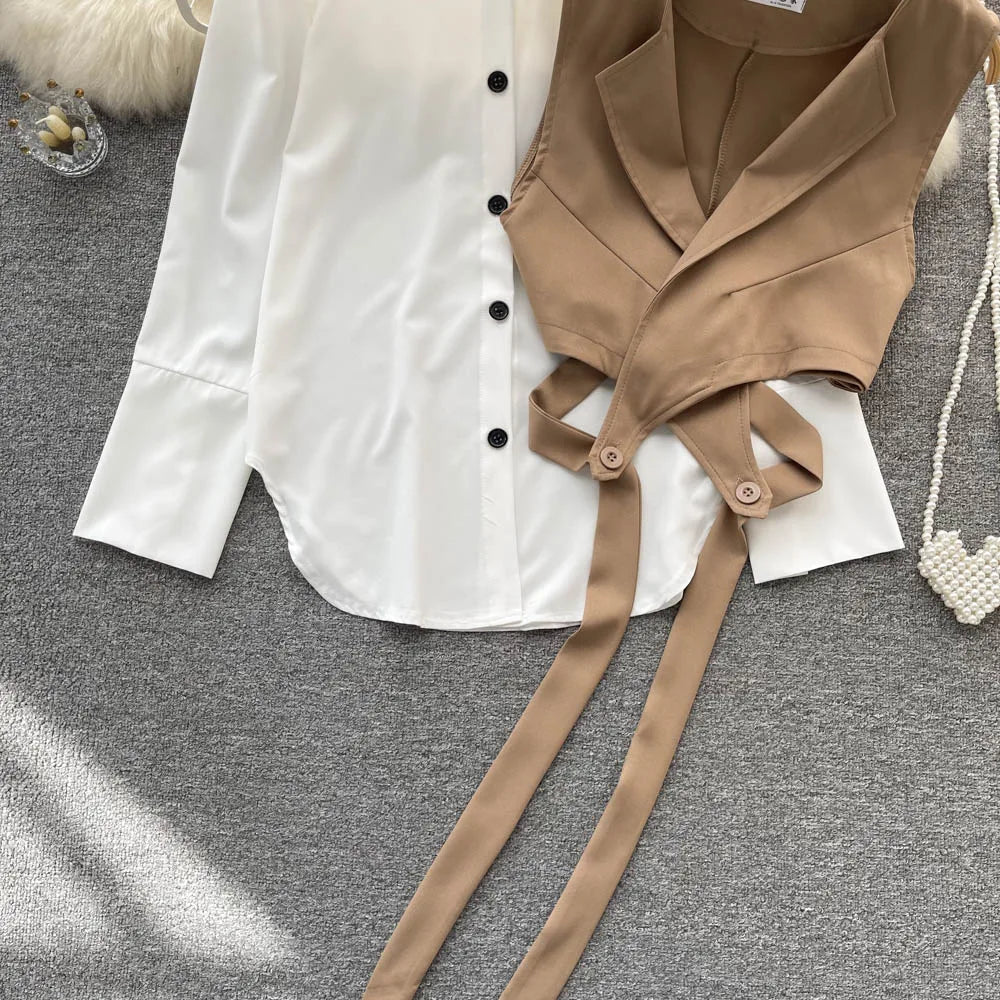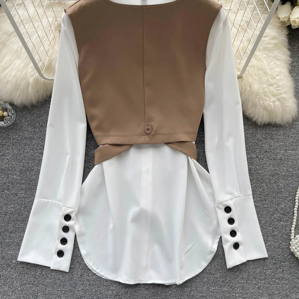 The chic white long-sleeve shirt and short vest combination allows for versatile styling, perfect for layering in cooler weather.