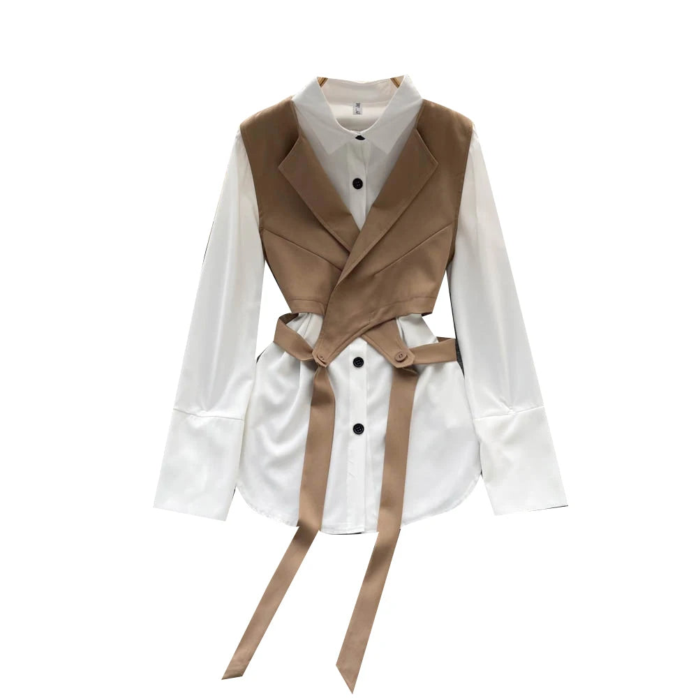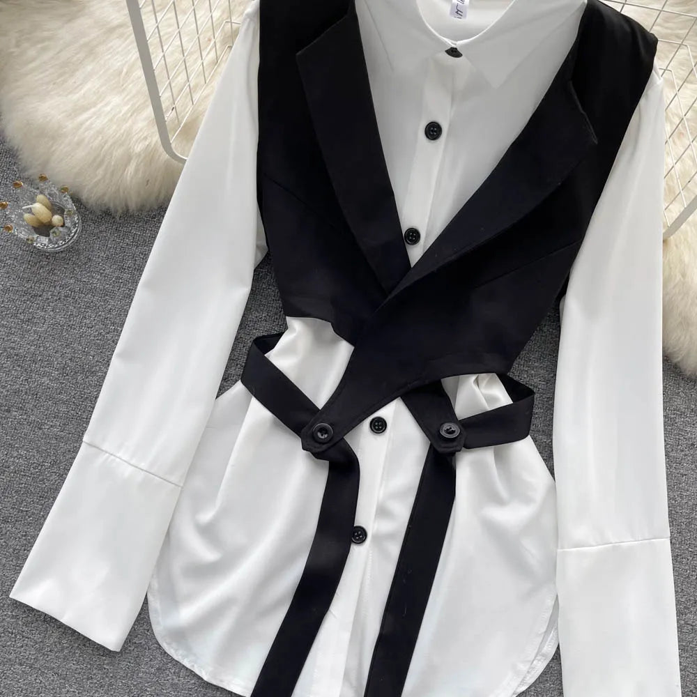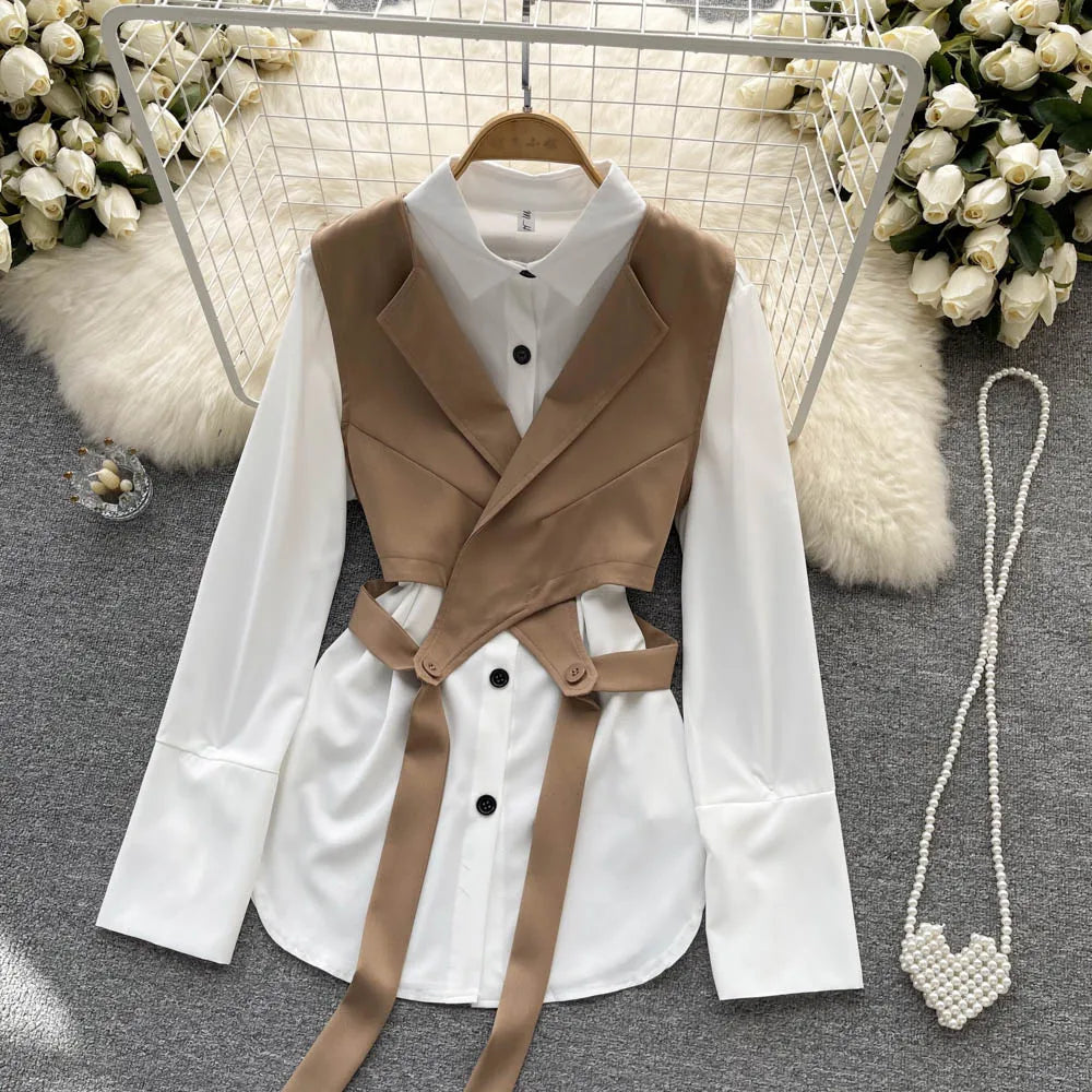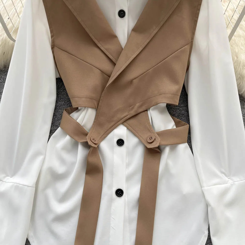 The chic white long-sleeve shirt and short vest combination allows for versatile styling, perfect for layering in cooler weather.