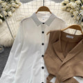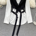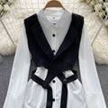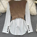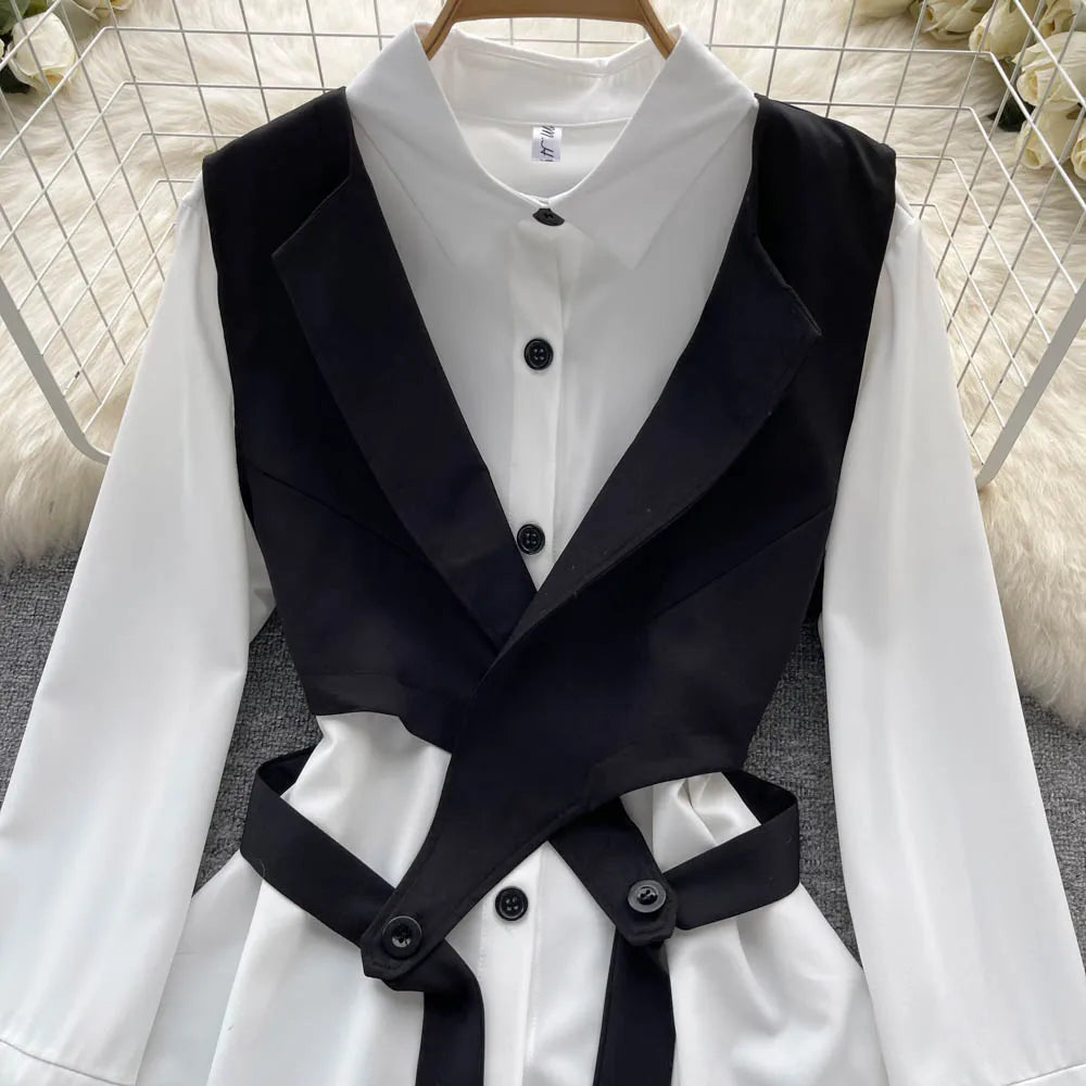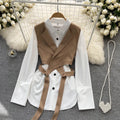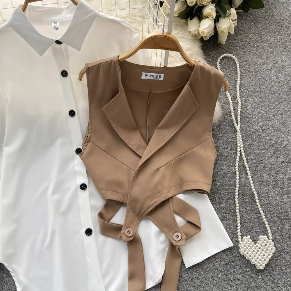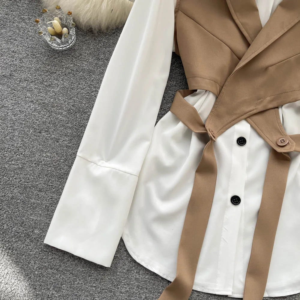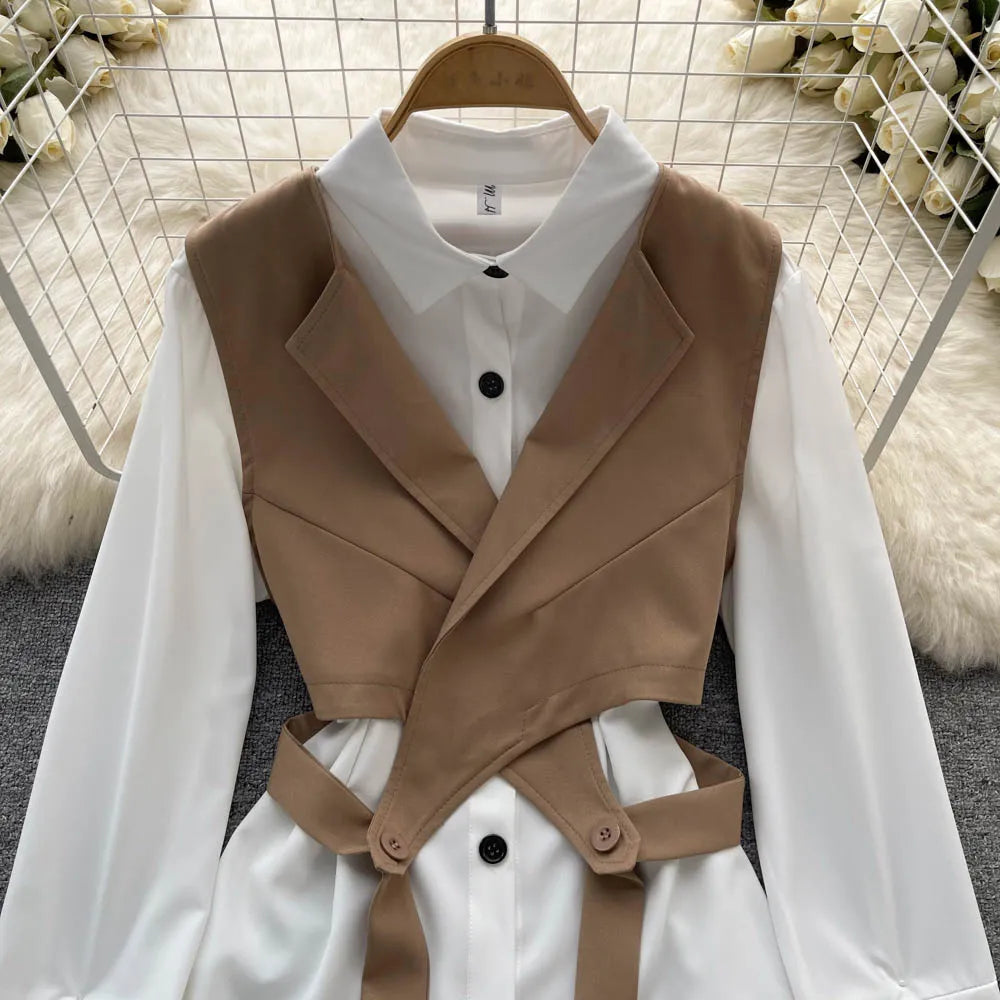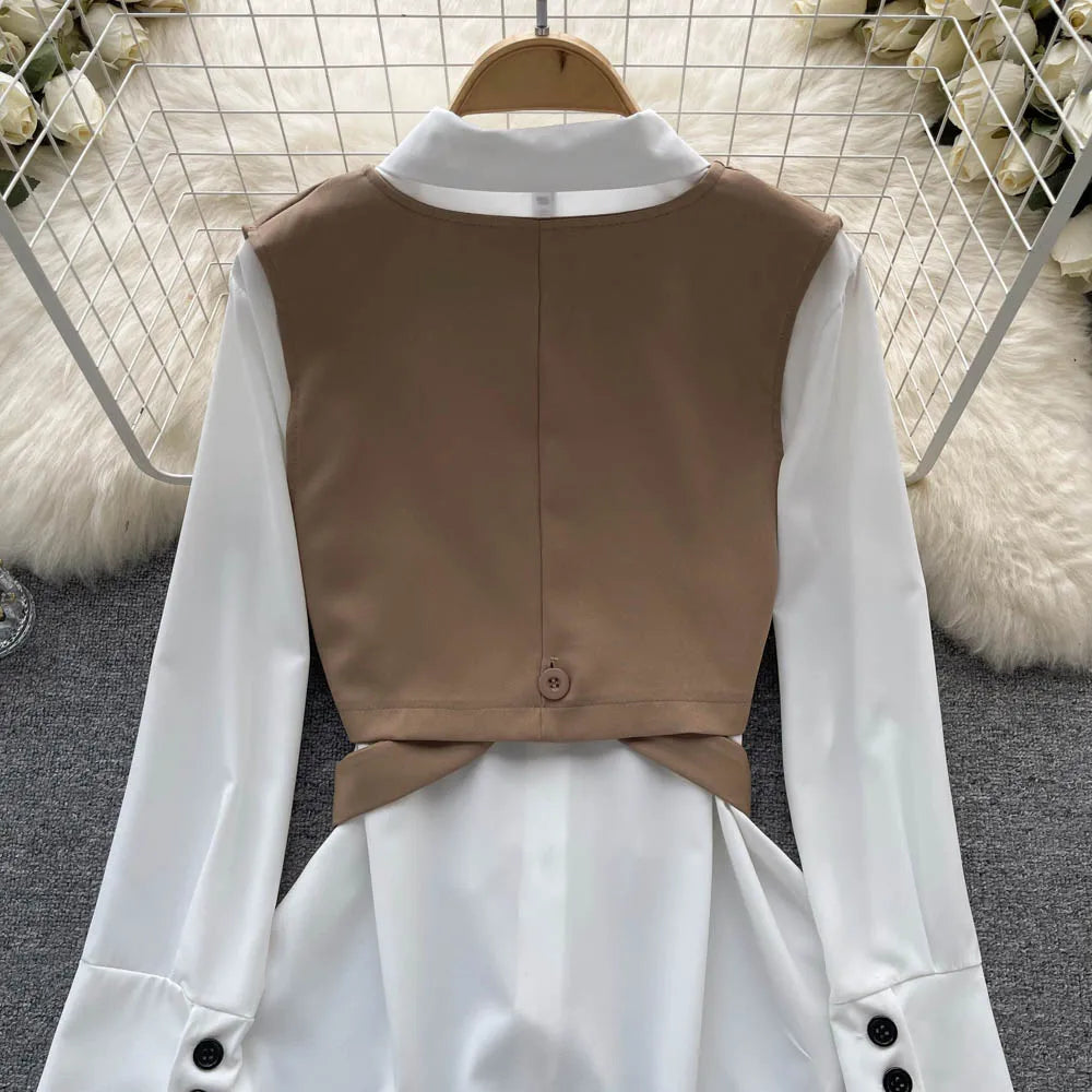 The chic white long-sleeve shirt and short vest combination allows for versatile styling, perfect for layering in cooler weather.