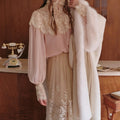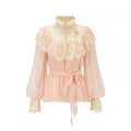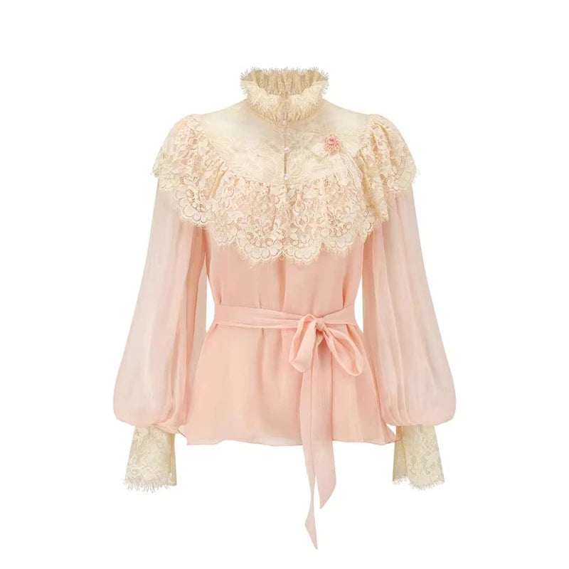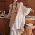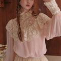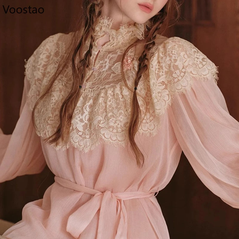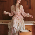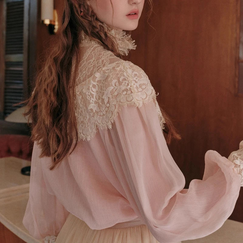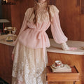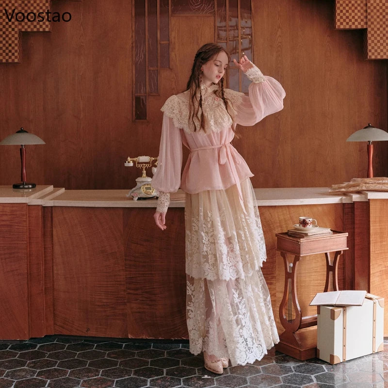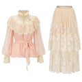 2 Piece Set Women Vintage | Lace Patchwork Long Sleeve Blouse Top Mesh Skirt Suit