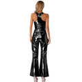 Tank top designs with deep u neck, sleeveless and racer-back; matches with bell-bottomed long pants. 2-piece suit is simple but stylish.