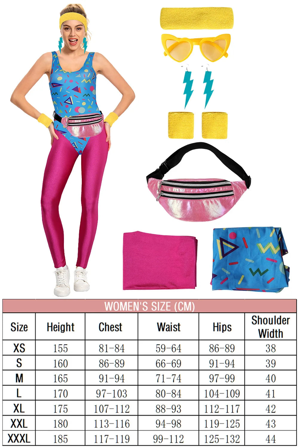 80s Retro Pattern Jumpsuit Vintage Cosplay Tracksuit Yoga Costume Headband Leggings Fanny Pack Set Clothing Women Halloween Suit