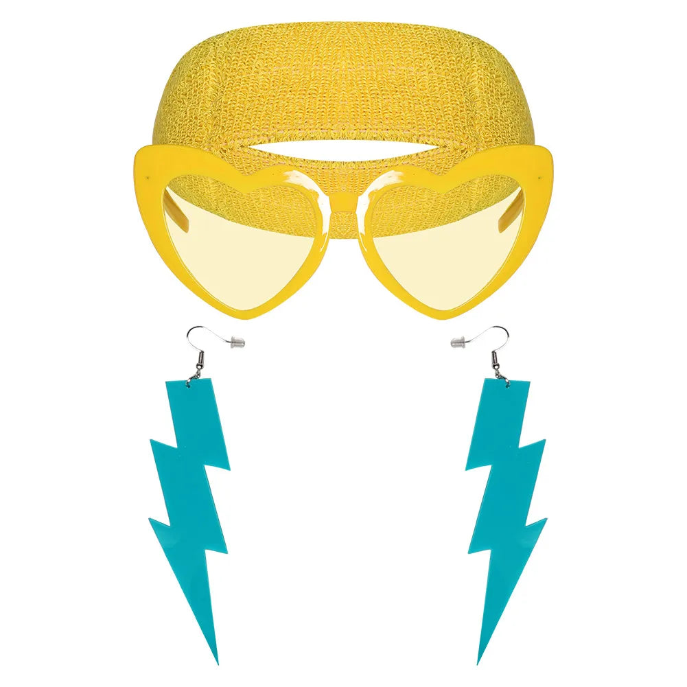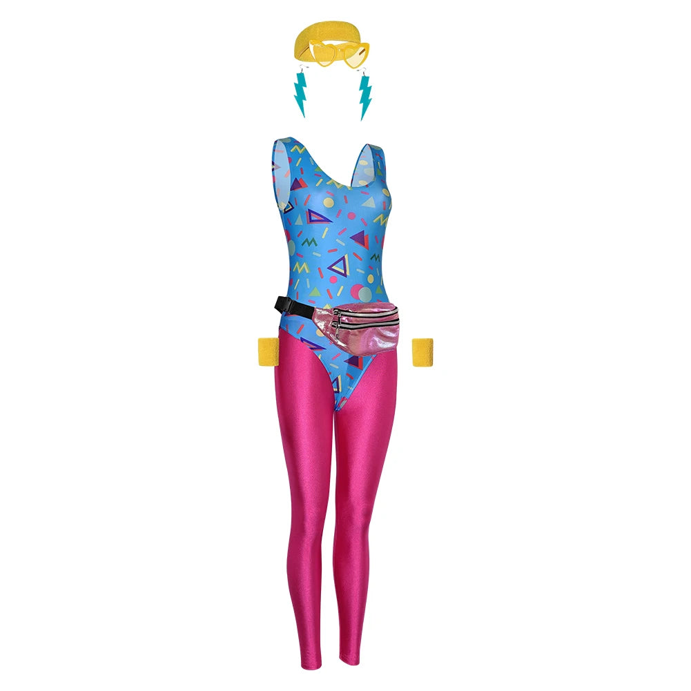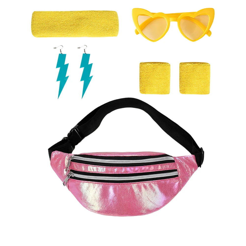 Included: Jumpsuit+leggings, glasses, headbands, wristbands, waist bags, leggings, earrings
