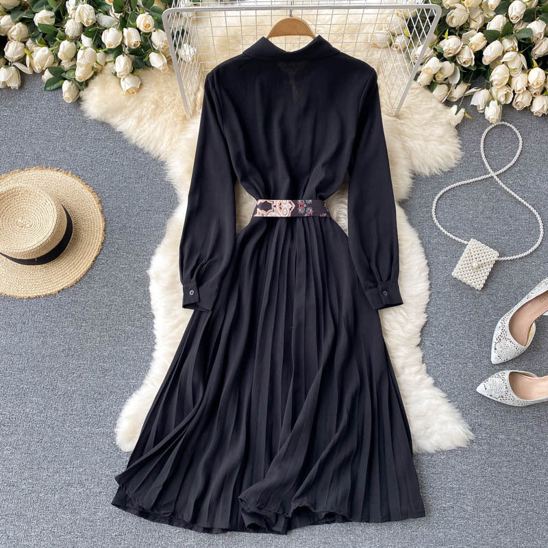 Features: POLO collar, high waist, long sleeve A-line skirt