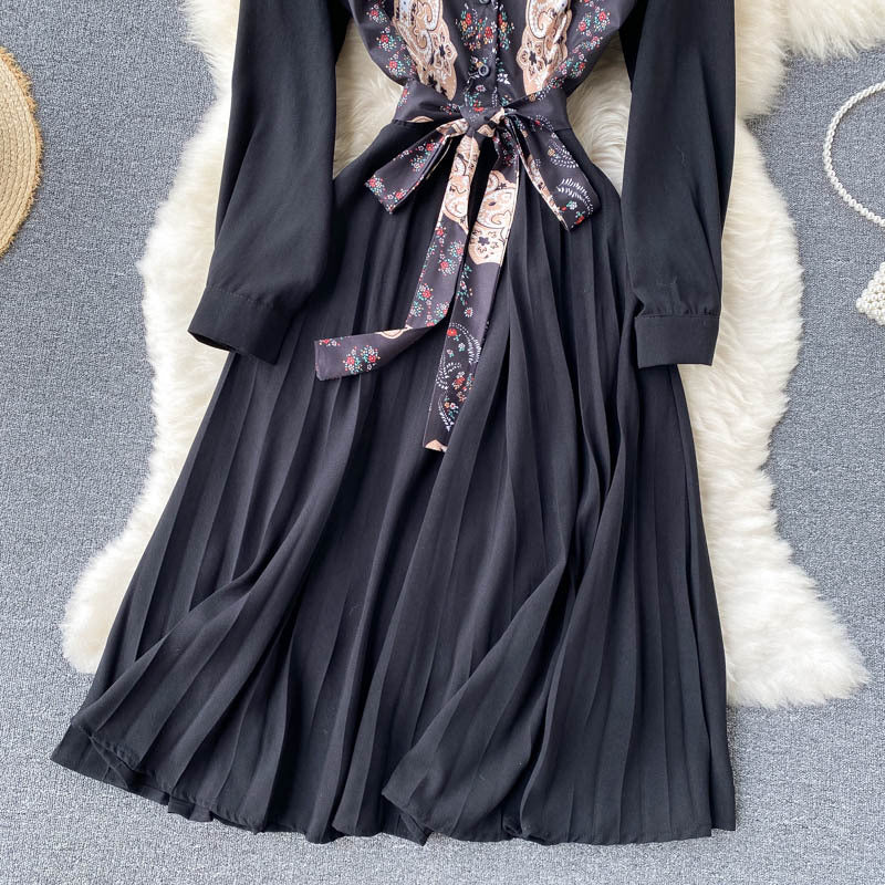 90s Guochao Retro Print Mid-Length Pleated Dress