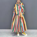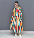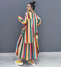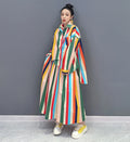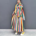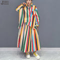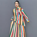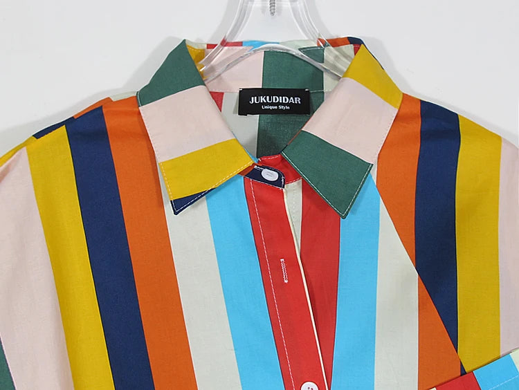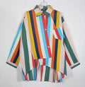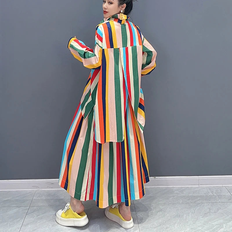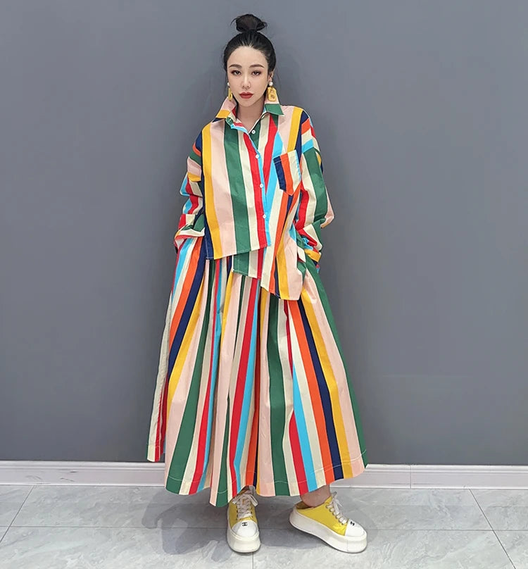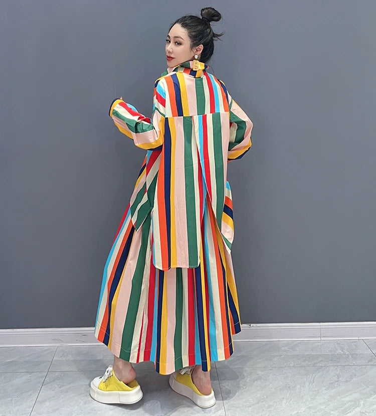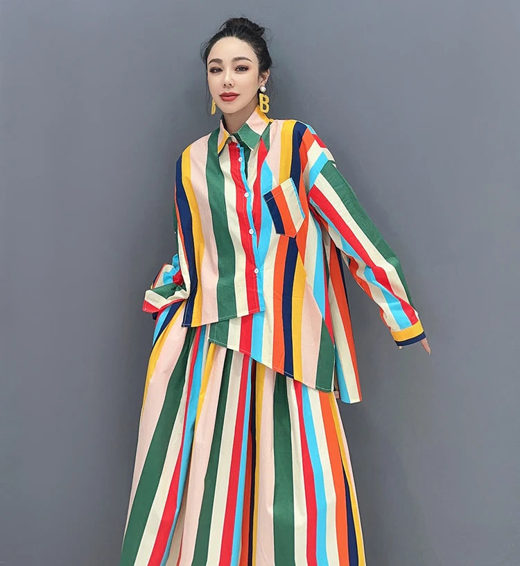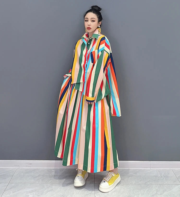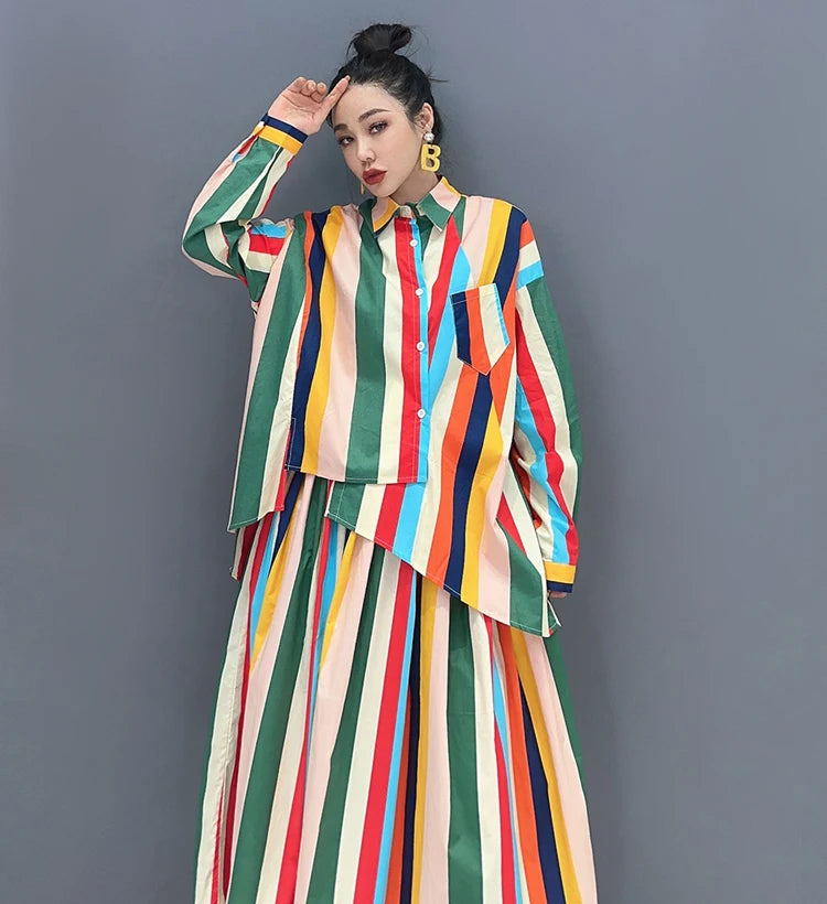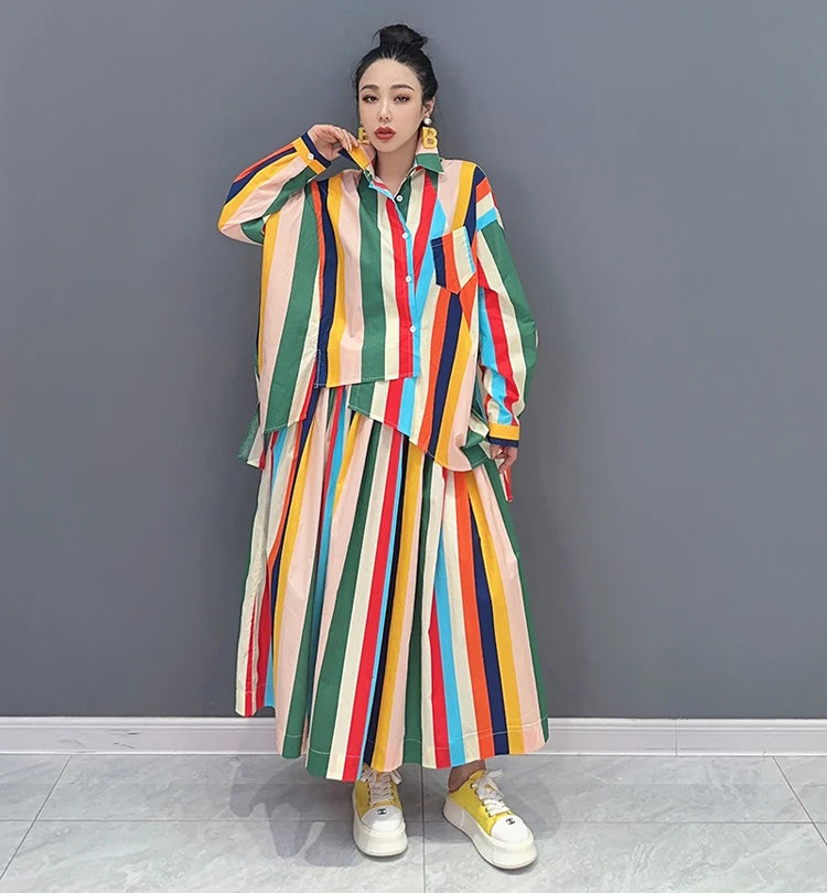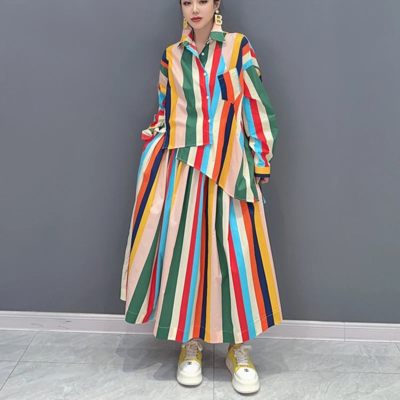 Korean Style Multicolor Striped Loose Fit Woman Casual Two Piece Set Irregular Shirt And Skirt Loose Fit Pastel Outfit JJSE033