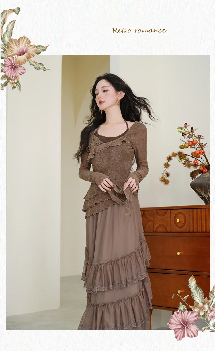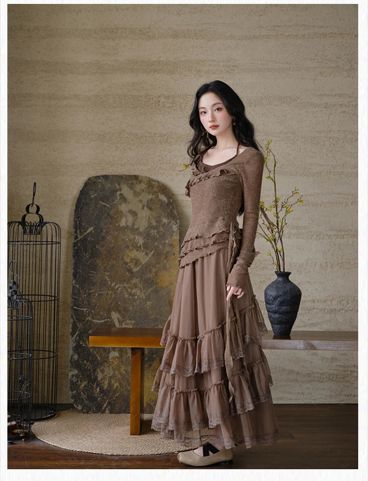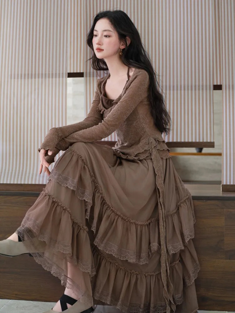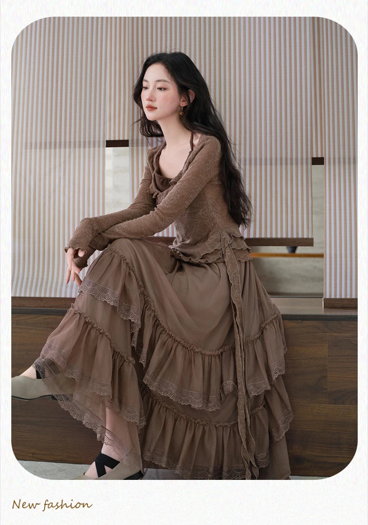 Autumn Outfits | Autumn Spring Women 2 Pcs Set Halter Knitted Top+Midi Layered Ruffles Mesh Skirt