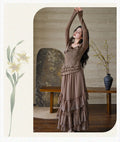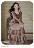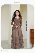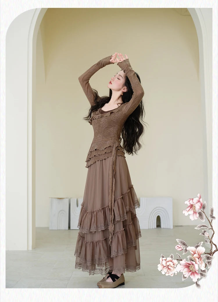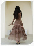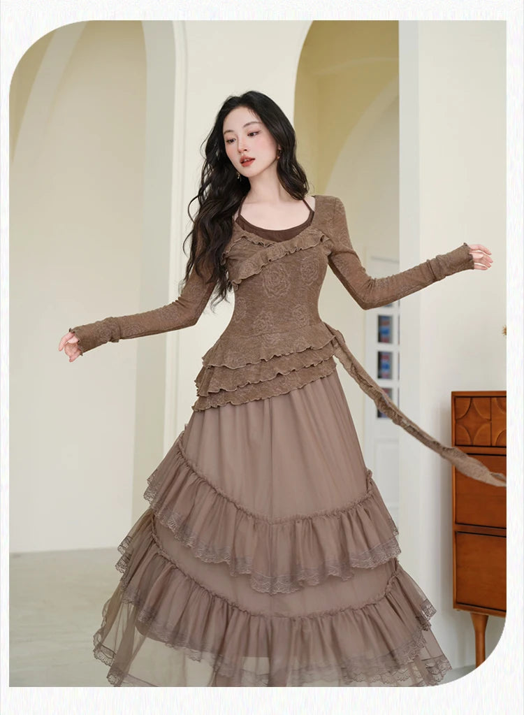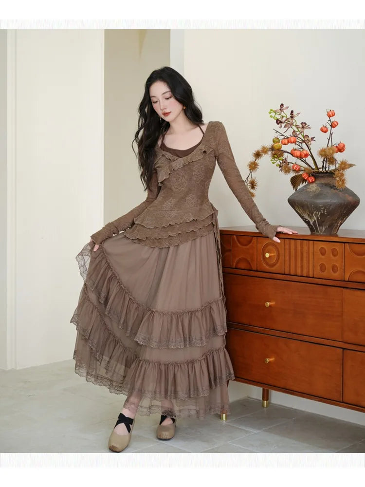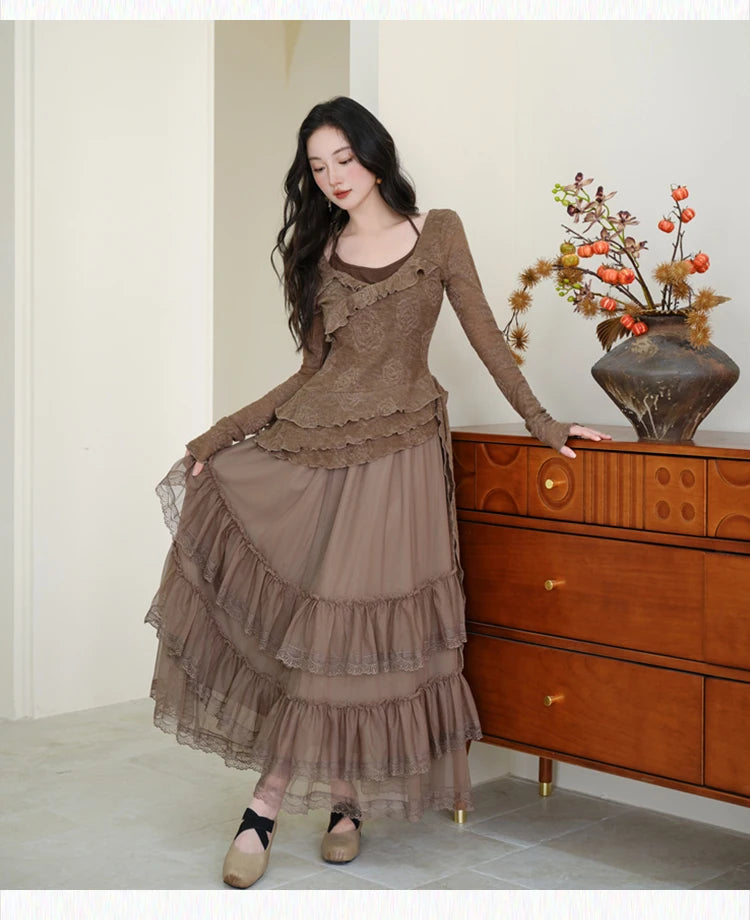 Autumn Outfits | Autumn Spring Women 2 Pcs Set Halter Knitted Top+Midi Layered Ruffles Mesh Skirt