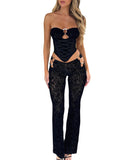 Women's Lace Mesh 2Pcs Outfits Off Shoulder Metal Ring Corset Tube Tops with Mid-Rise Flare Leggings Set Streetwear
