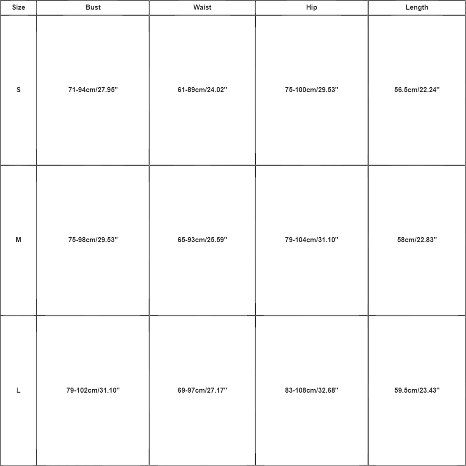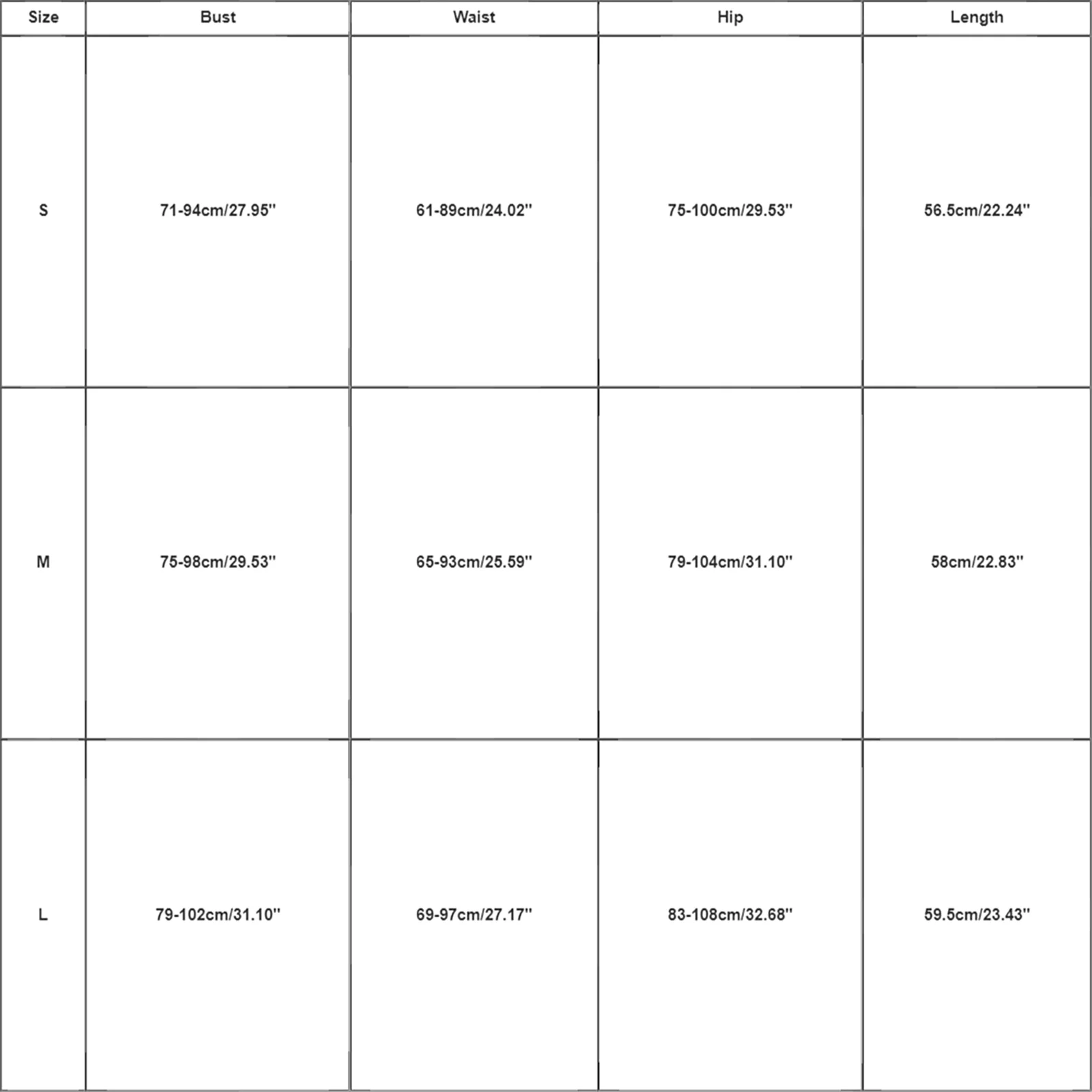 Size:S | Bust:71-94cm/27.95'' | Waist:61-89cm/24.02'' | Hip:75-100cm/29.53'' | Length:56.5cm/22.24'' |