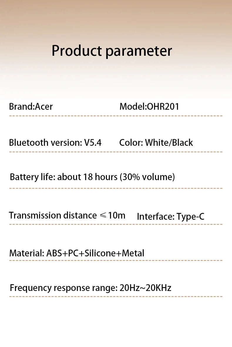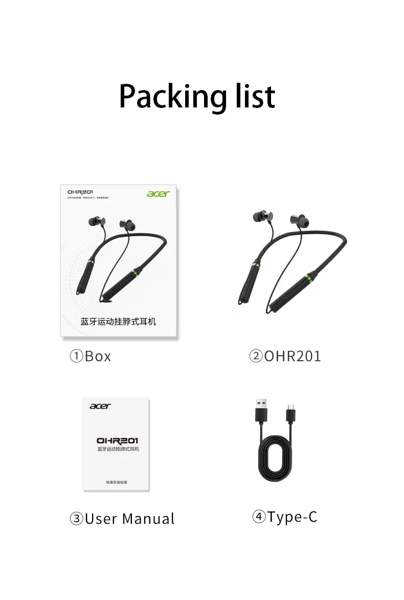 Acer OHR201 Wireless Earphone Bluetooth 5.4 Neckband Headphone HIFI Sound Sport Magnetic Headset Waterproof Earbuds with ENC Mic
