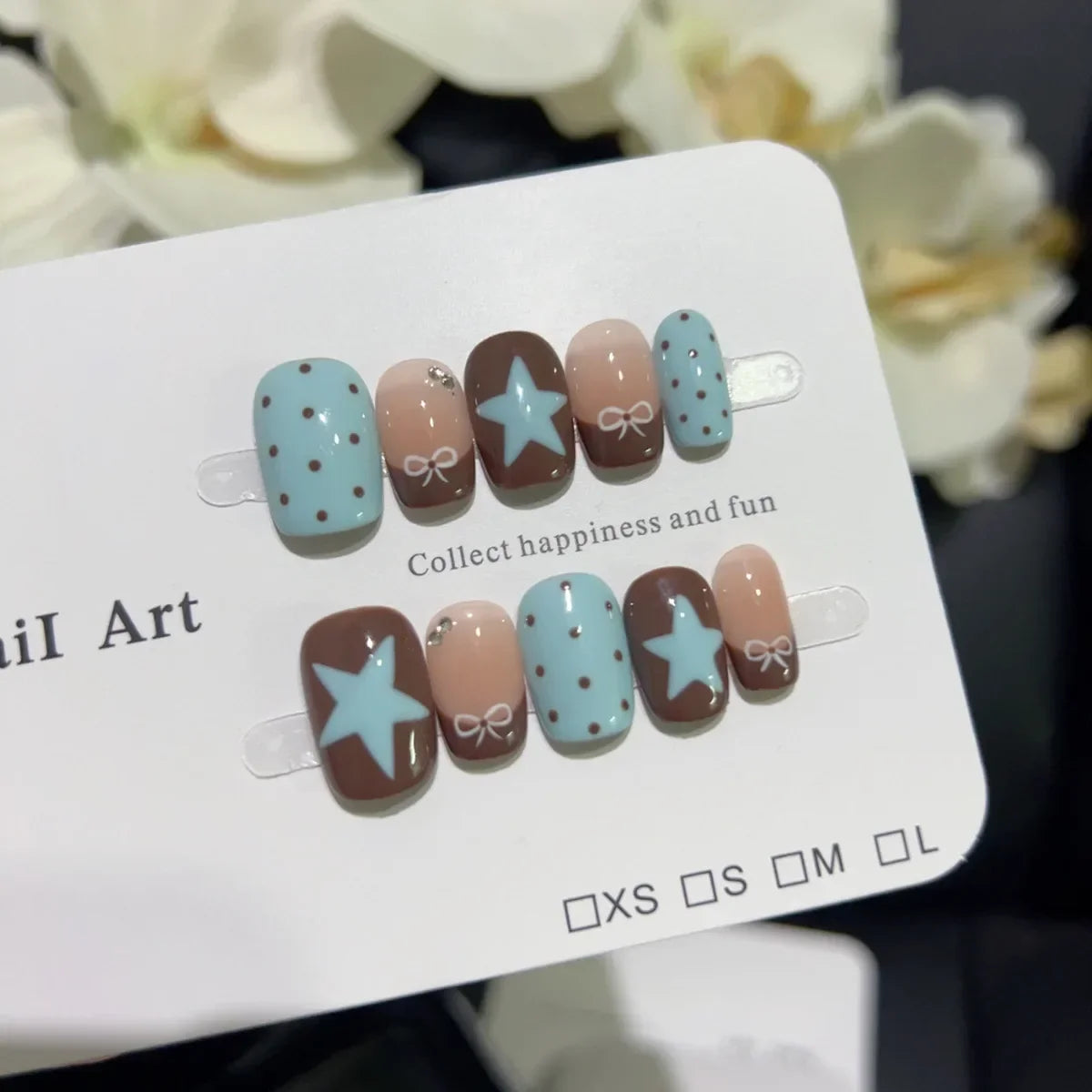10 Blue Polka Dot Nails | Bow Star Design Fake Nail Wearable Nail Art Tips for Girls