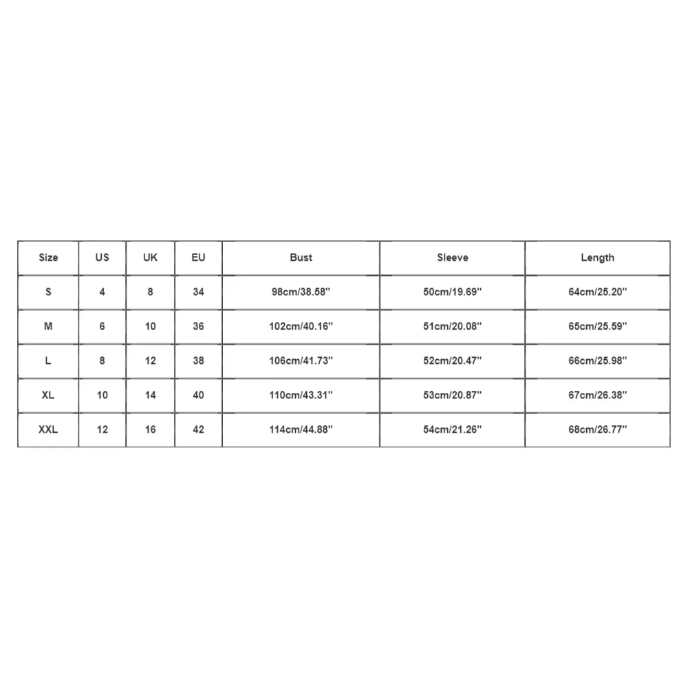Size:XL | US:10 | UK:14 | EU:40 | Bust:110cm/43.31'' | Sleeve:53cm/20.87'' | Length:67cm/26.38'' |