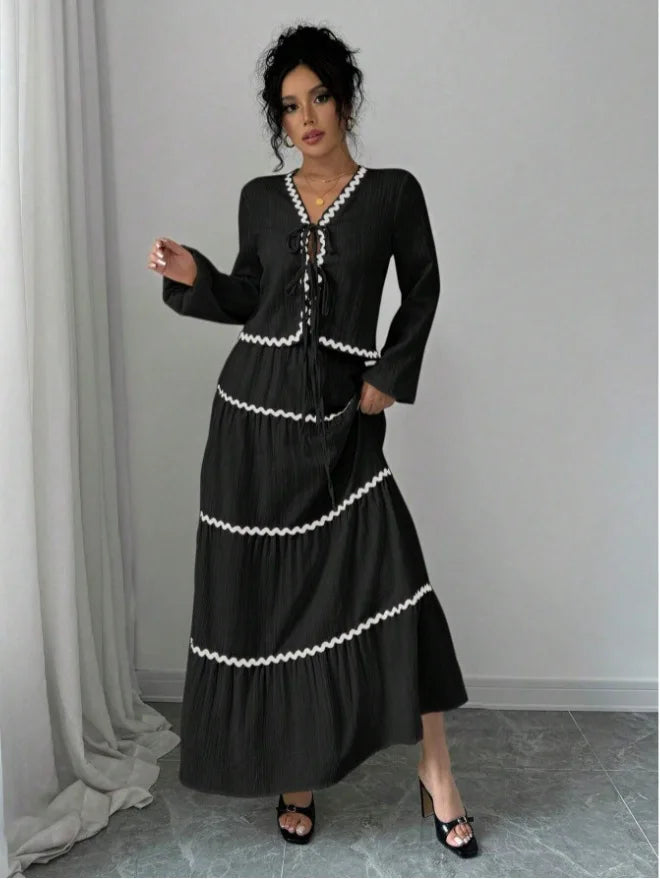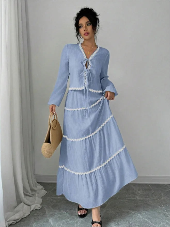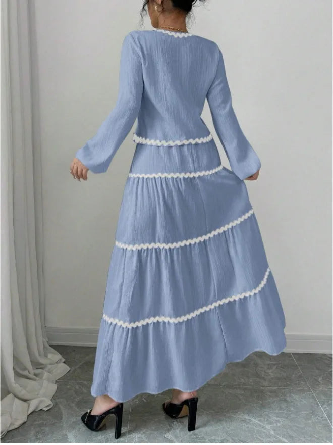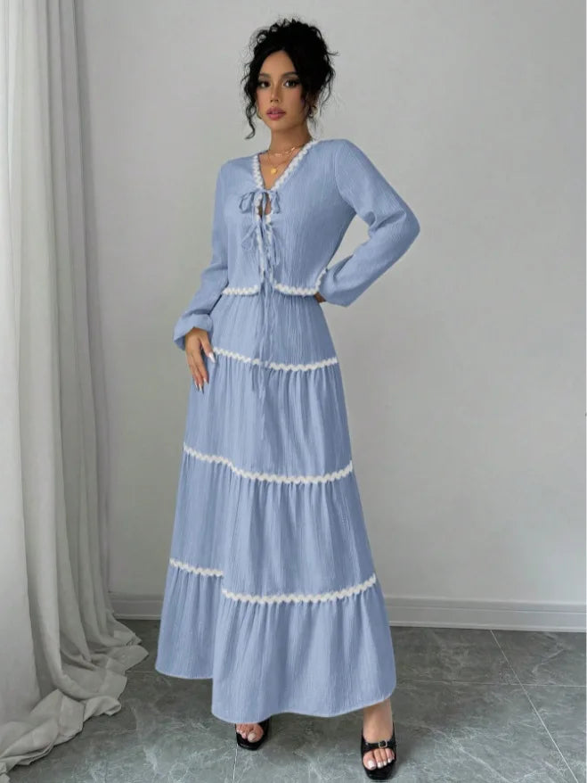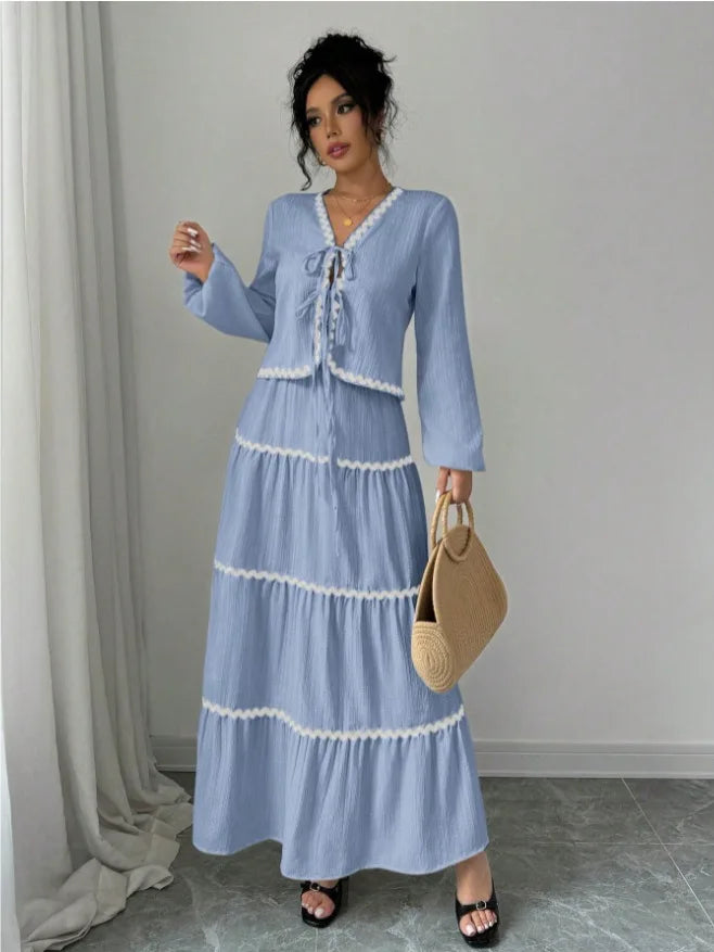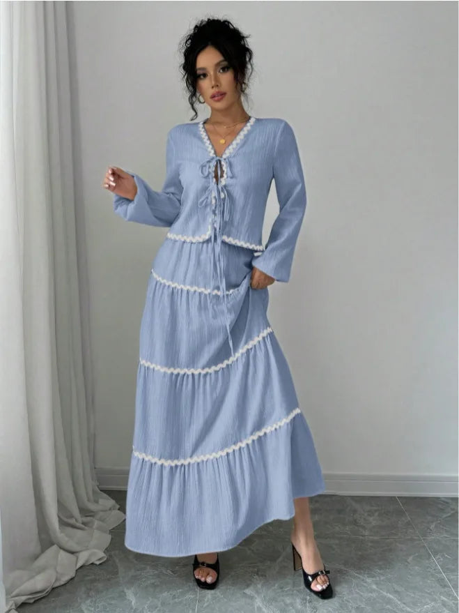 Casual Autumn Outfits For Ladies | Fashion Lace Layered Pleated Lantern Sleeve Bow Shirt Skirt 2 Piece Outfit E