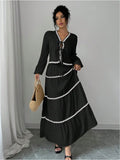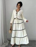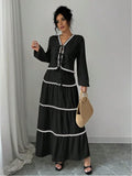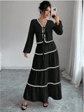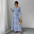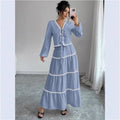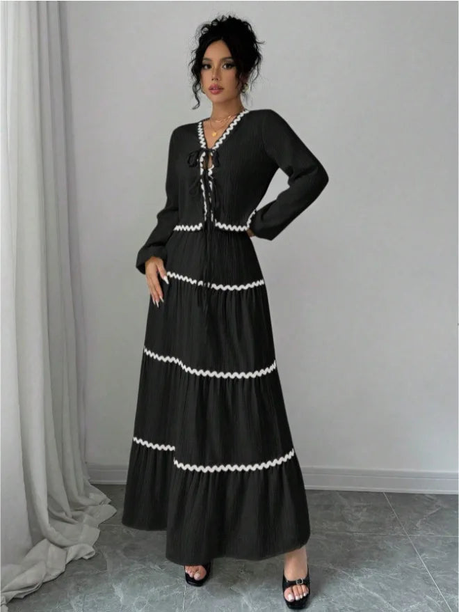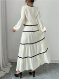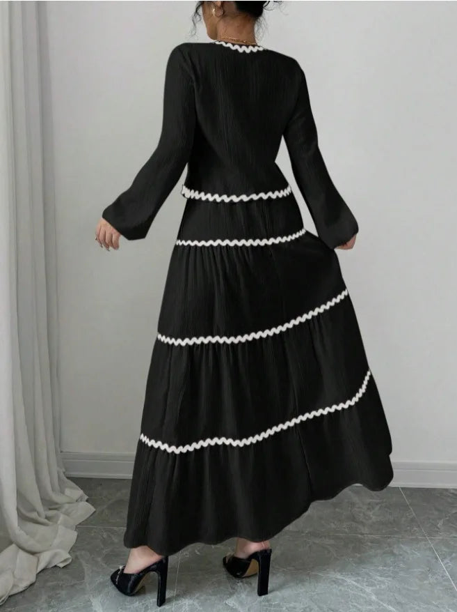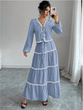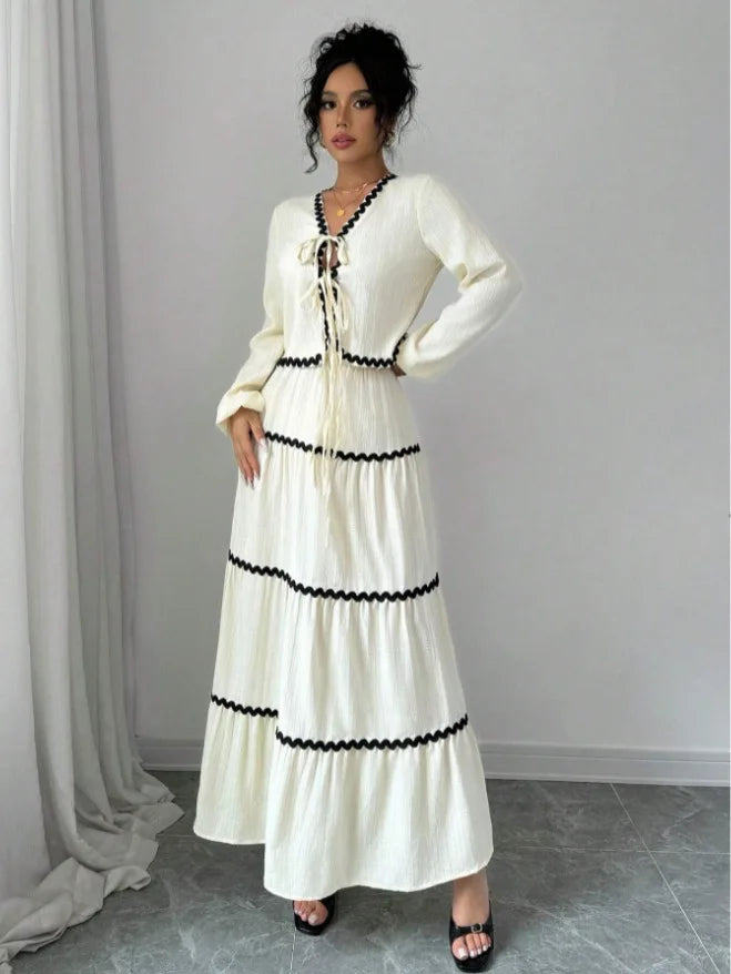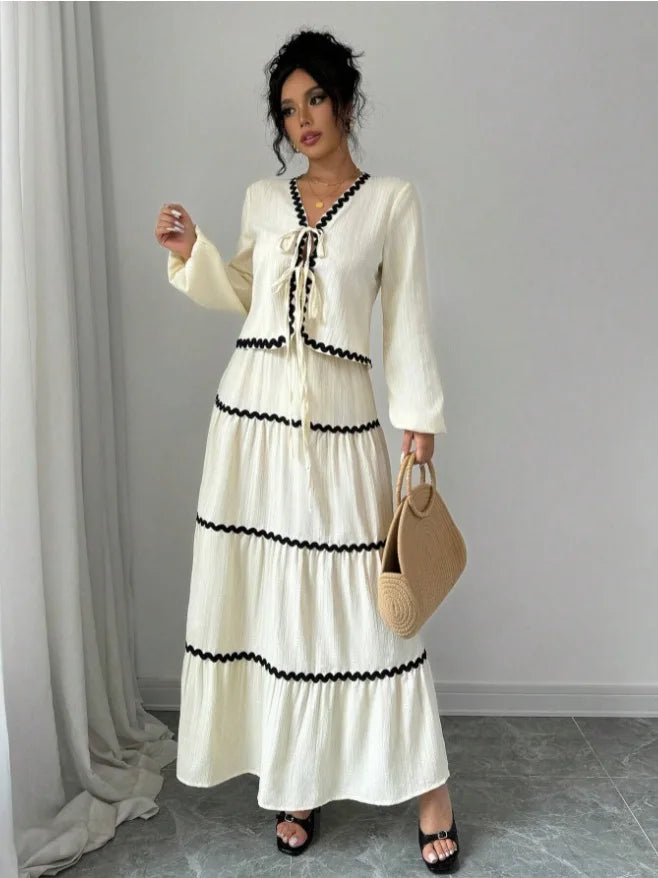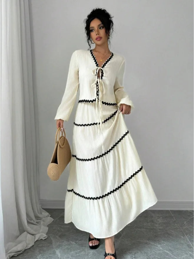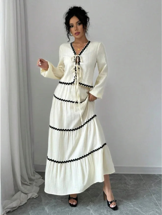 Casual Autumn Outfits For Ladies | Fashion Lace Layered Pleated Lantern Sleeve Bow Shirt Skirt 2 Piece Outfit E