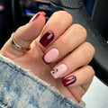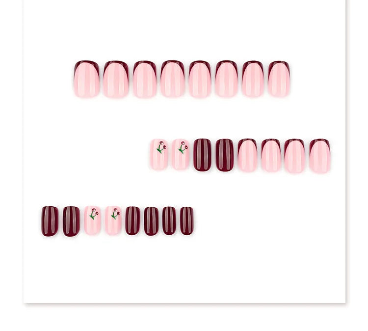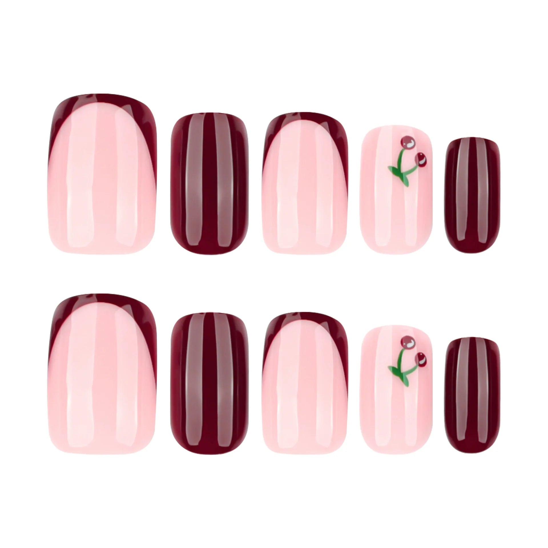 24pcs False Nails French Wine Red Simple Short Square Nails Cherry-shaped Press-on Full-coverage Nail Stickers Suitable for Girl