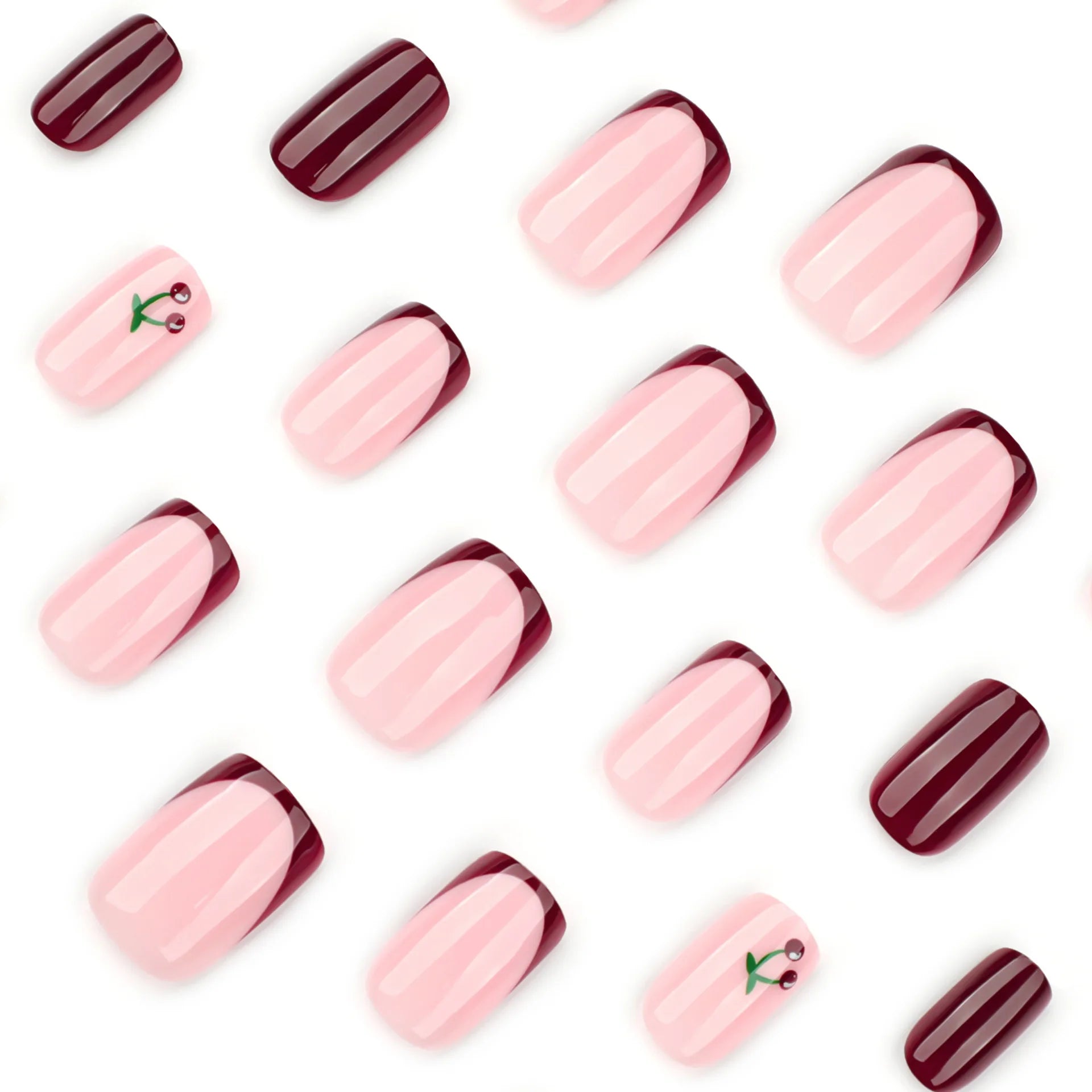 24 Cherry Nails French Tip | Short Square Nails Cherry-shaped Press-on Full-coverage Nail Stickers