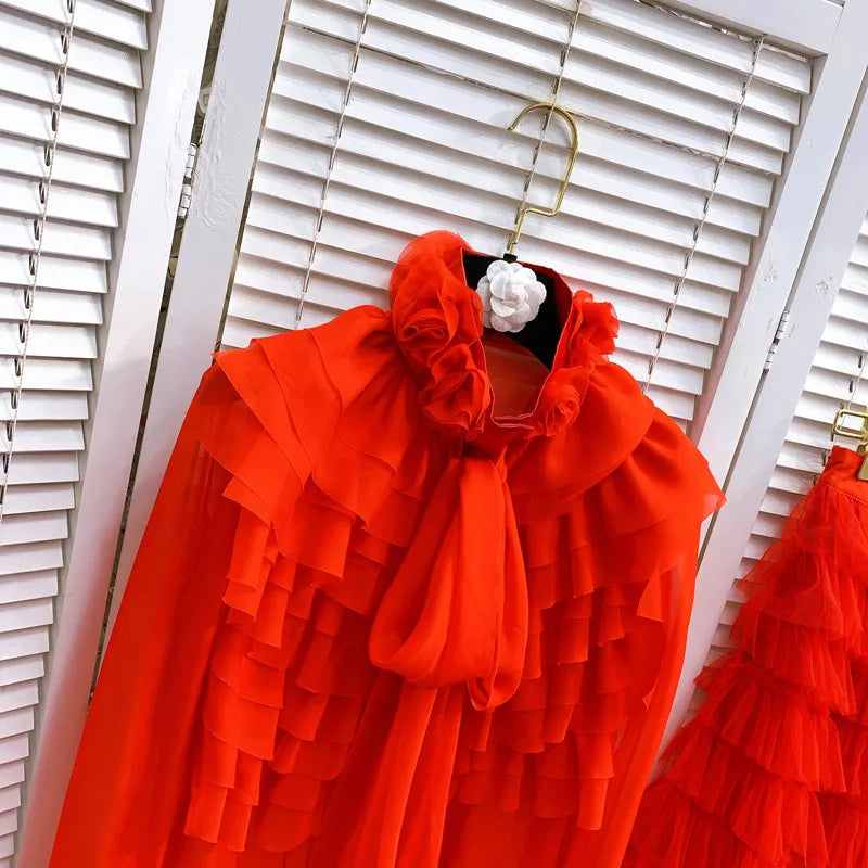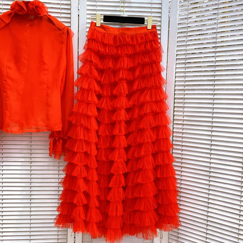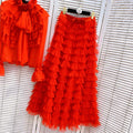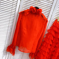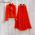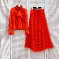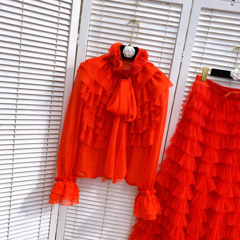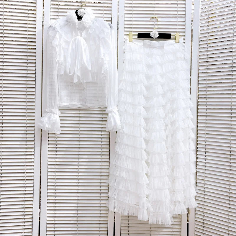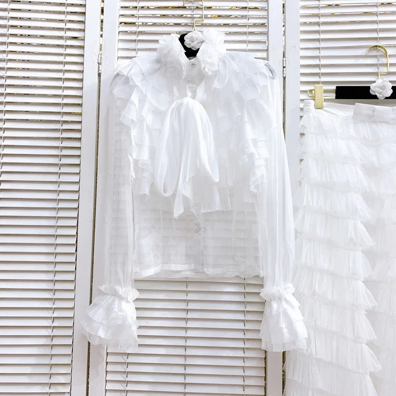 Chiffon Shirts | French Elegant Commuter Lace-up Bow Flared Sleeve Chiffon Shirts High Waist | Long Skirt Two-piece Set Women