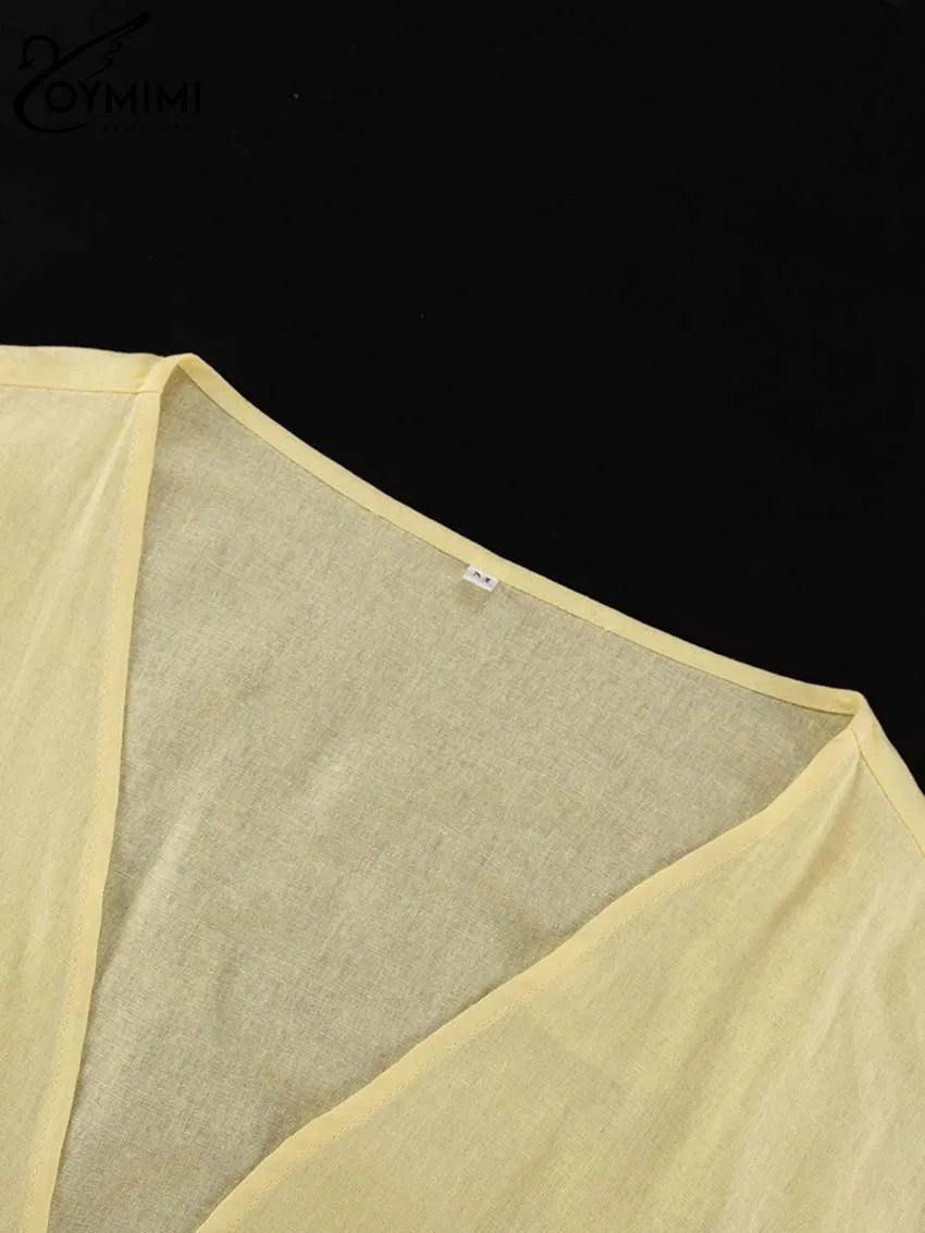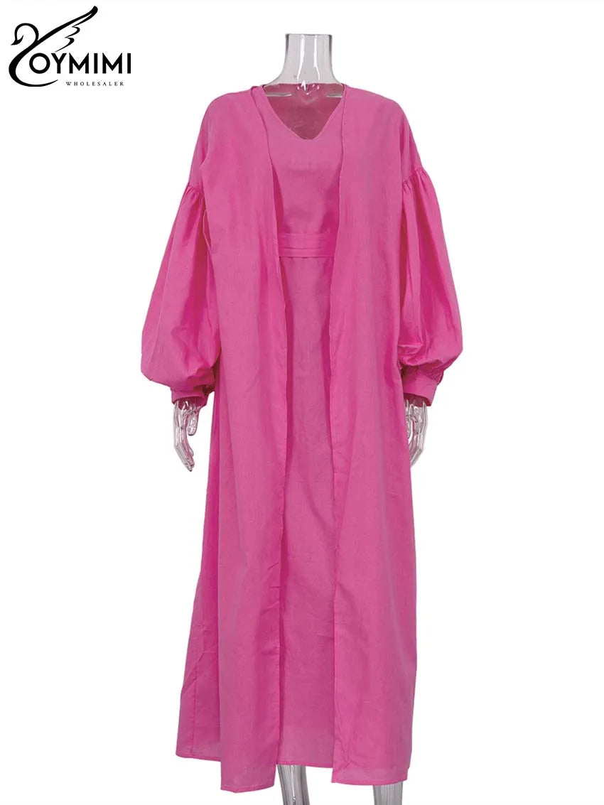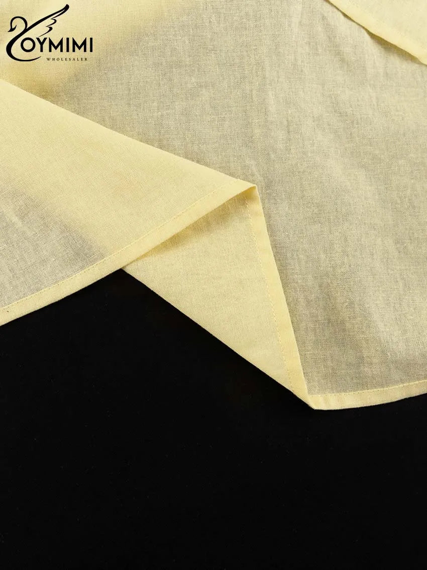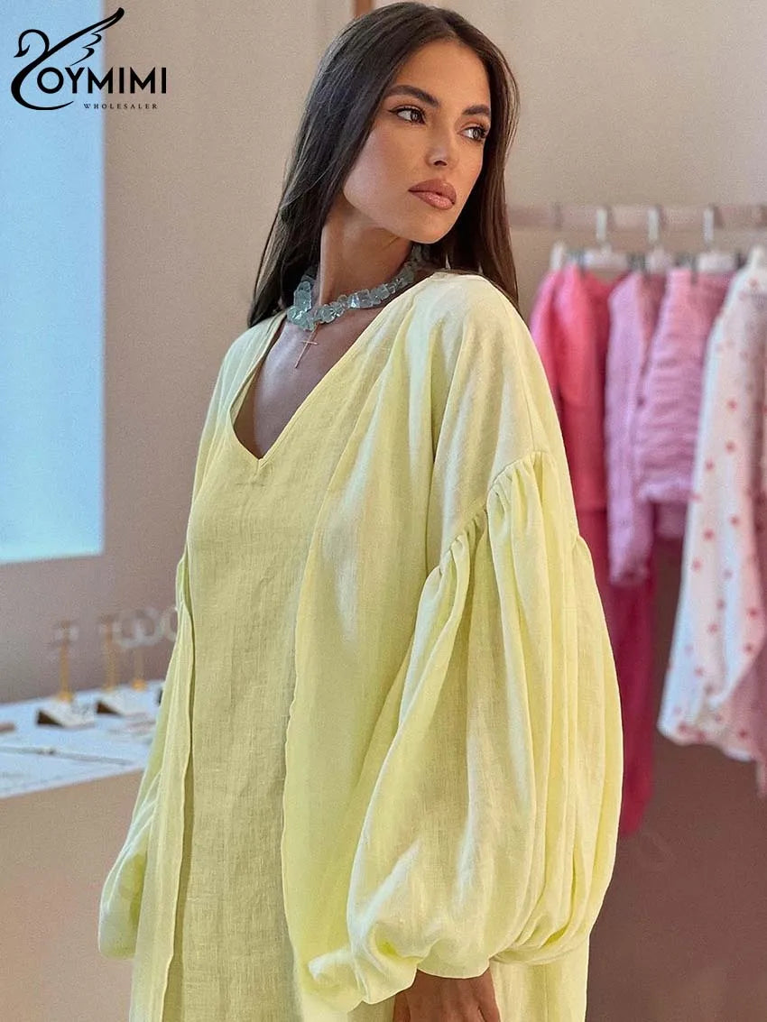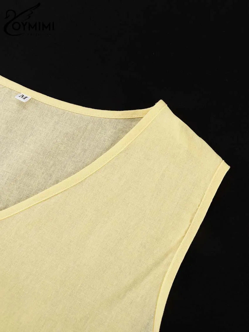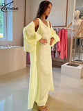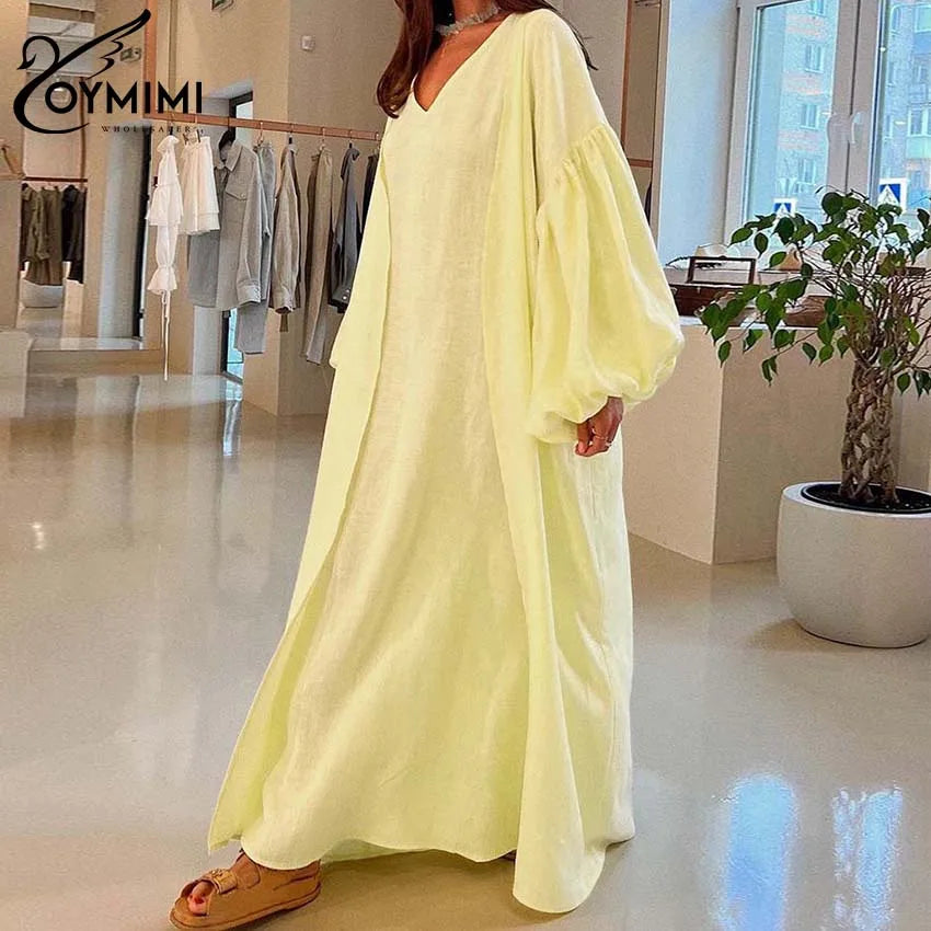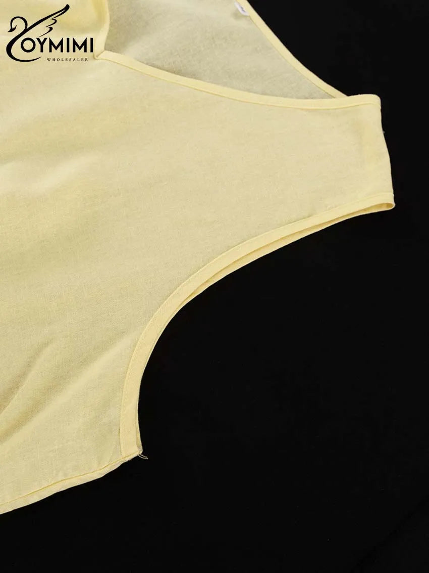 Classy Summer Outfits For Ladies | Oymimi Elegant Yellow Cotton Hemp 2 Pc Sets | Sleeve Robe And V-Neck Sleeveless Floor-Length Dress Sets