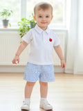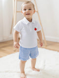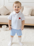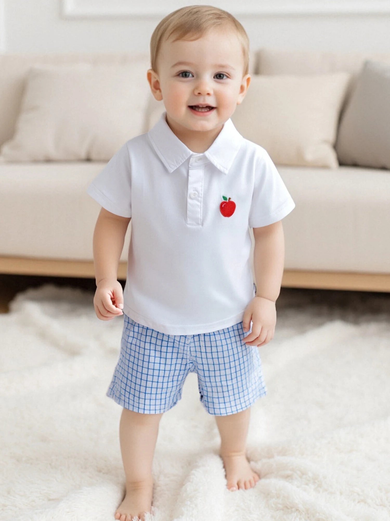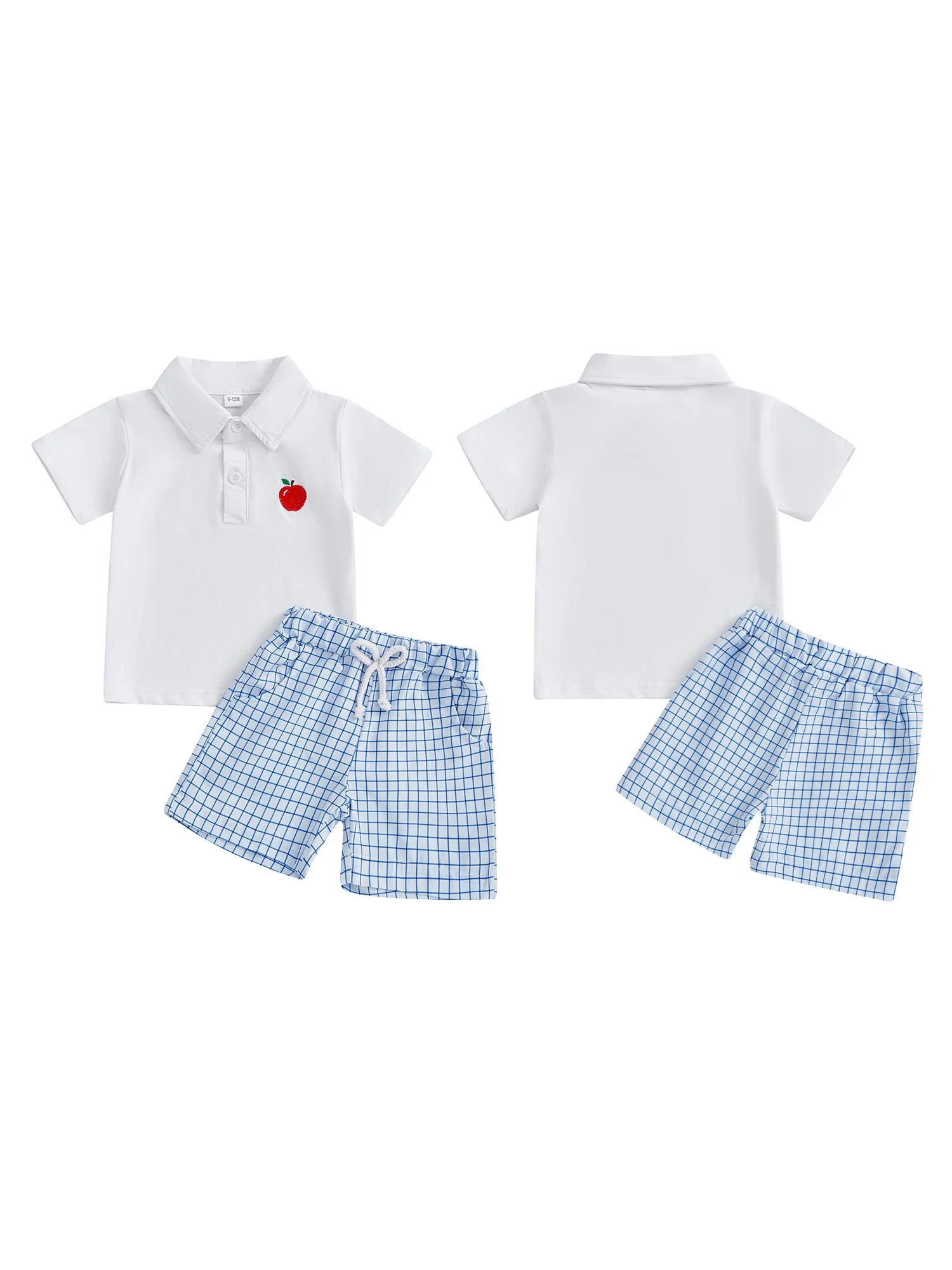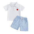 Cool Back To School Outfits For Boys with Apple Embroidered Short Sleeve Shirt and Grid Elastic Waist Shorts - 2 Piece