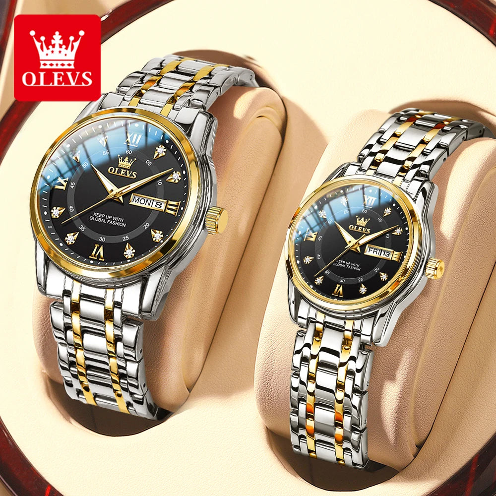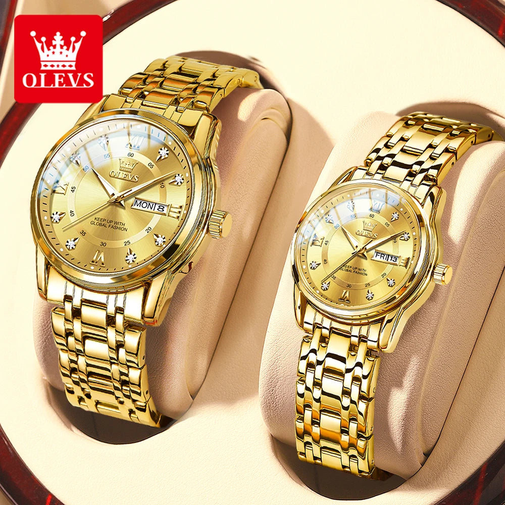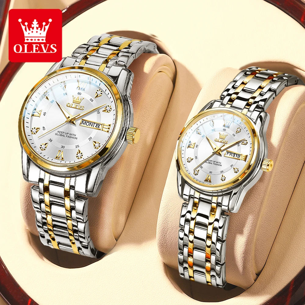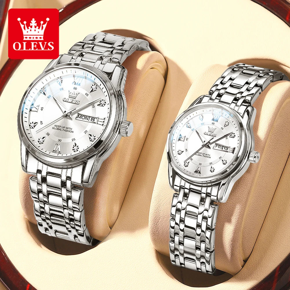 OLEVS 5513 Couple Watch For Wedding | Stainless Steel Waterproof Double Calendar Trendy Quartz Watch