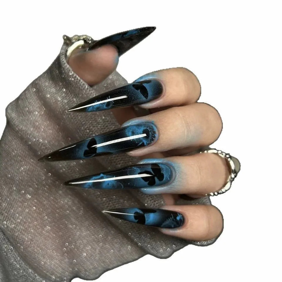 24 Dark Blue Butterfly Nails | Y2k False Nails | Spicy Girls Gradient French Pointed Fake Nails