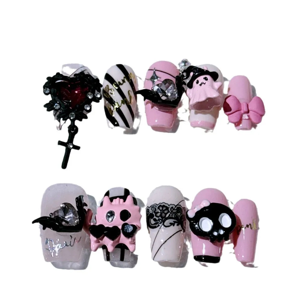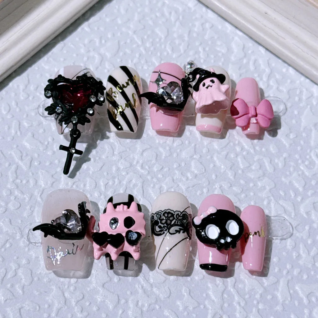Cute Funny Ghost Handmade Wear Nails Devil's Heart Halloween Fake Nails Pink Bow Cartoon Short Nail Art