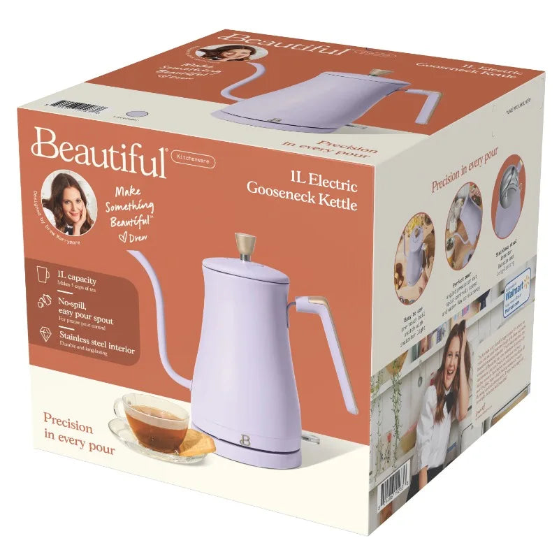 Feel like a true artisan with the Beautiful 1L Electric Gooseneck Kettle. Perfect for pour-over coffee and teas, the Gooseneck Kettle is designed for precision pouring. Created by Drew Barrymore, Beautiful Kitchenware® combines elegant design and contemporary colors for high-performance appliances that look beautiful on your kitchen counter. Condition: new.