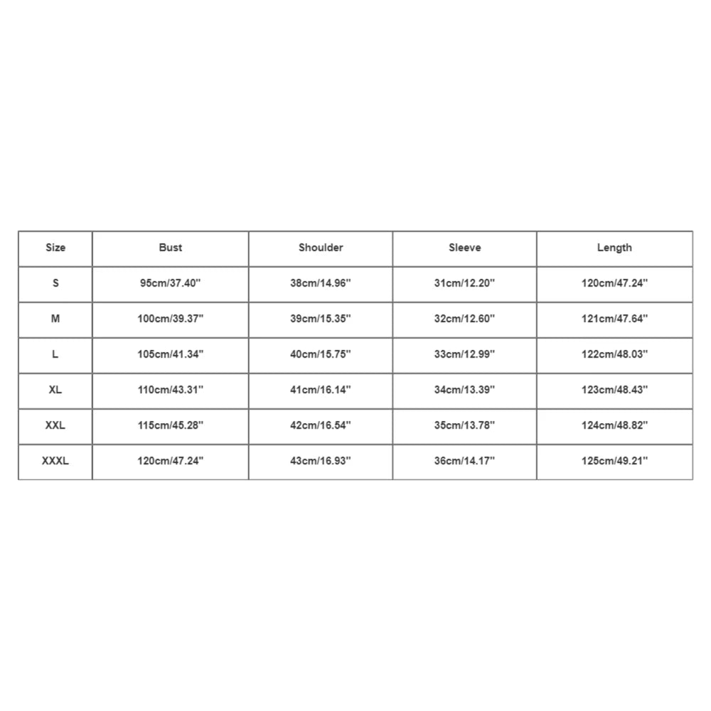 Size:XXXL | Bust:120cm/47.24'' | Shoulder:43cm/16.93'' | Sleeve:36cm/14.17'' | Length:125cm/49.21'' |