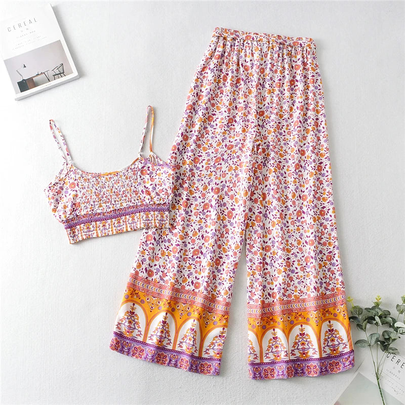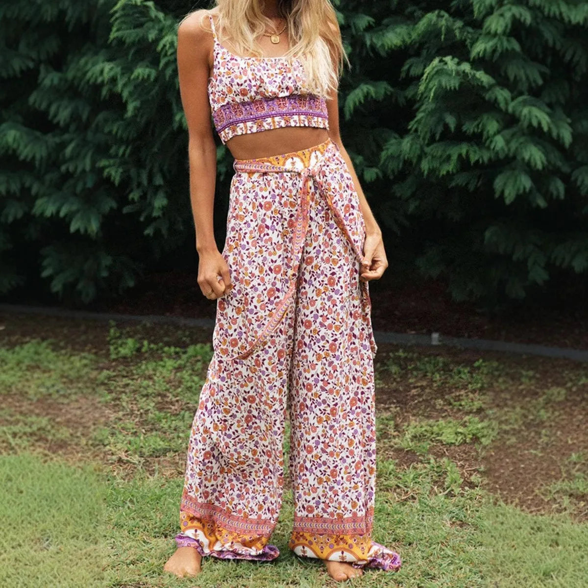 Boho Queens Floral Two Piece Outfits | Strap Sleeveless Tops Bohemian Pants 2 Pieces