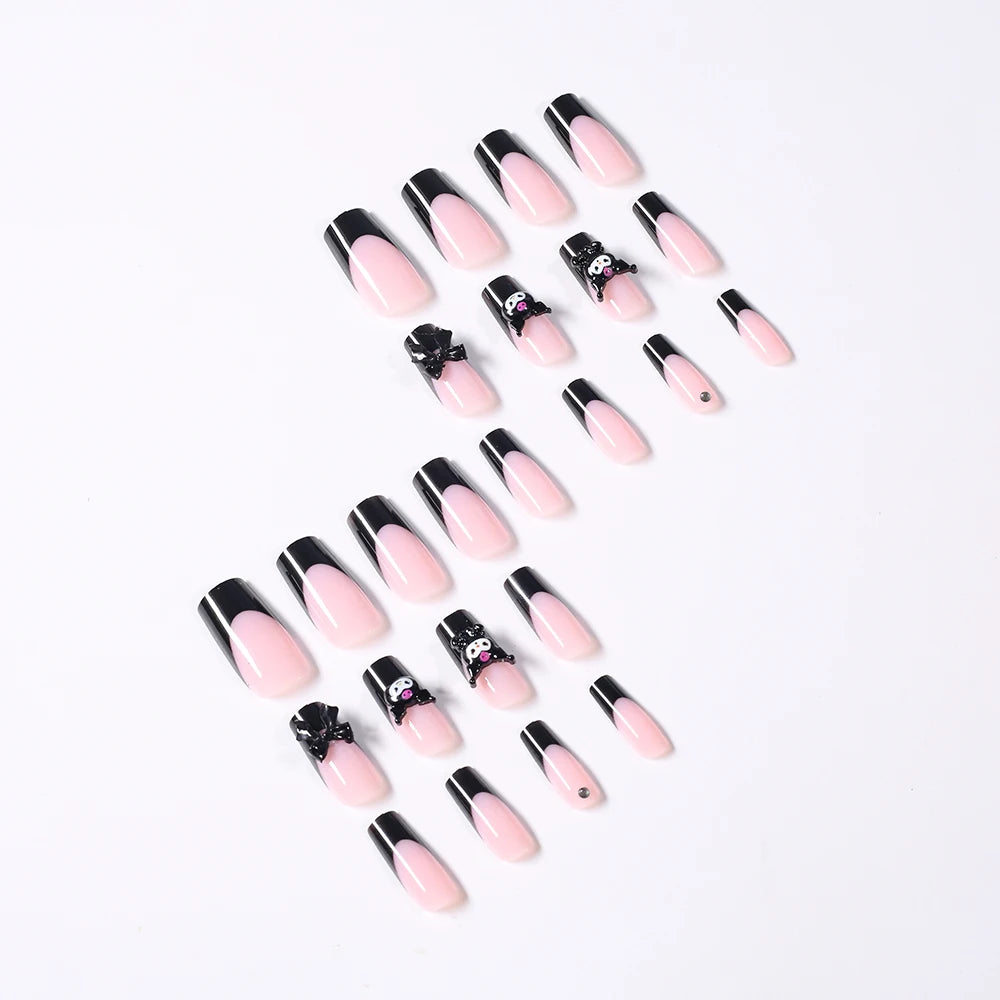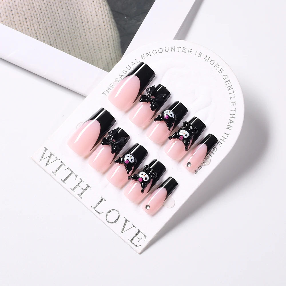 24 Hello Kitty Press On Nails | Cute Cartoon Black Square Fake Nails with Bow
