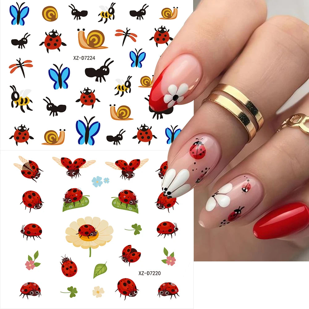 This set offers a variety of cute insect designs including ladybugs, butterflies, bees, ants, four-leaf clovers, and flowers, perfect for creating unique nail art.