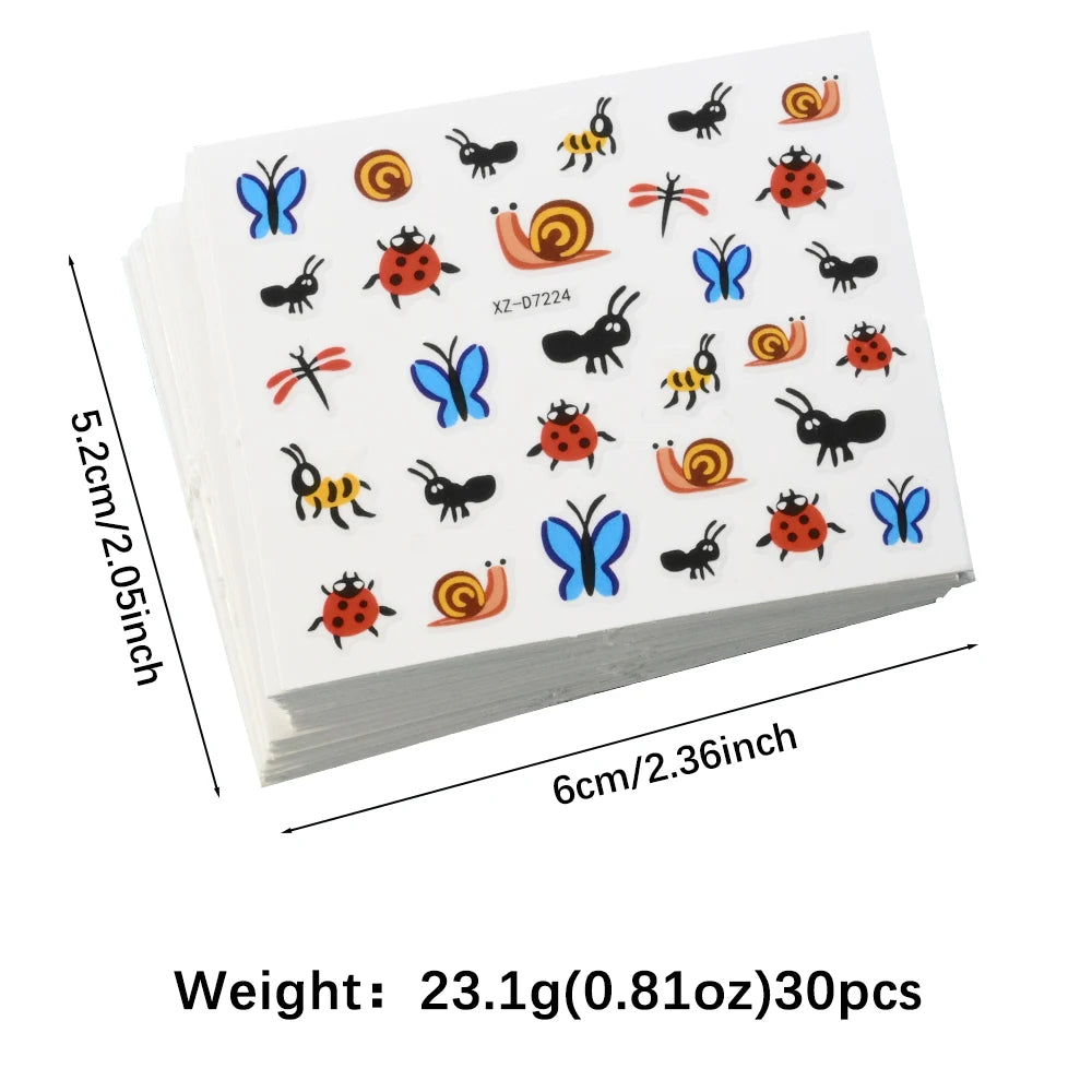 30Pcs 3D Cartoon Ladybug/Butterfly Nail Stickers Cute Insect,Bee,Ant,Four Leaf Clover,Flowers Nail Art Decals DIY Manicure Decorations