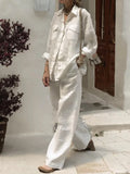 Linen Set Women | Spring Autumn Lapel Shirt Solid Pocket |  Wide Leg Pants | Two Piece Sets