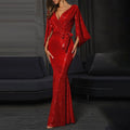 "Sophisticated Glamour: Step into the spotlight with this stunning, solid-color gown featuring a graceful slit and sparkling sequins. A perfect blend of style for your special evening affair."