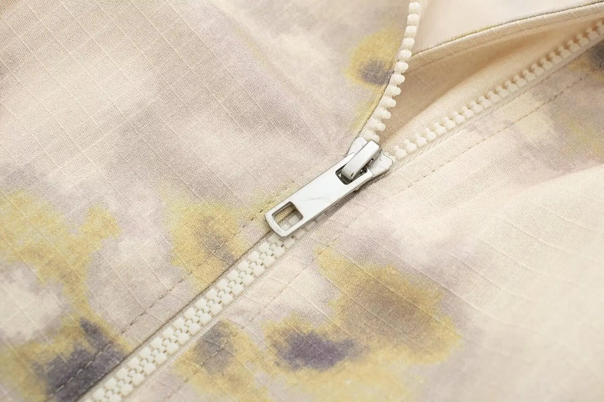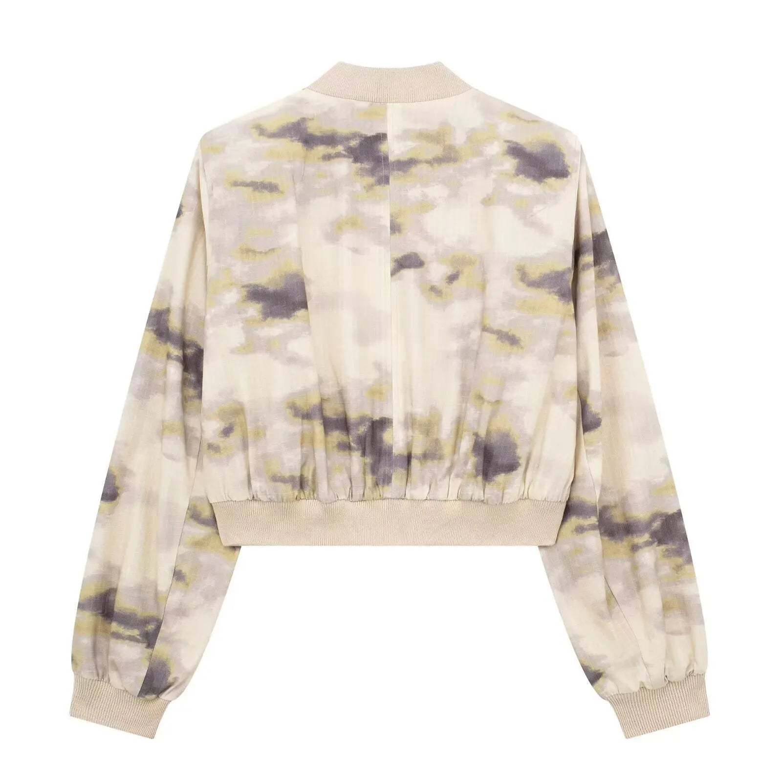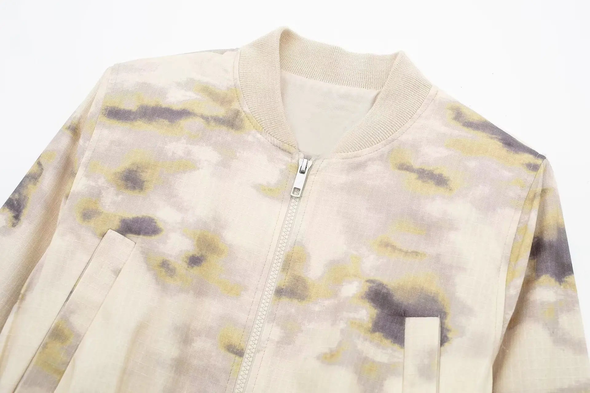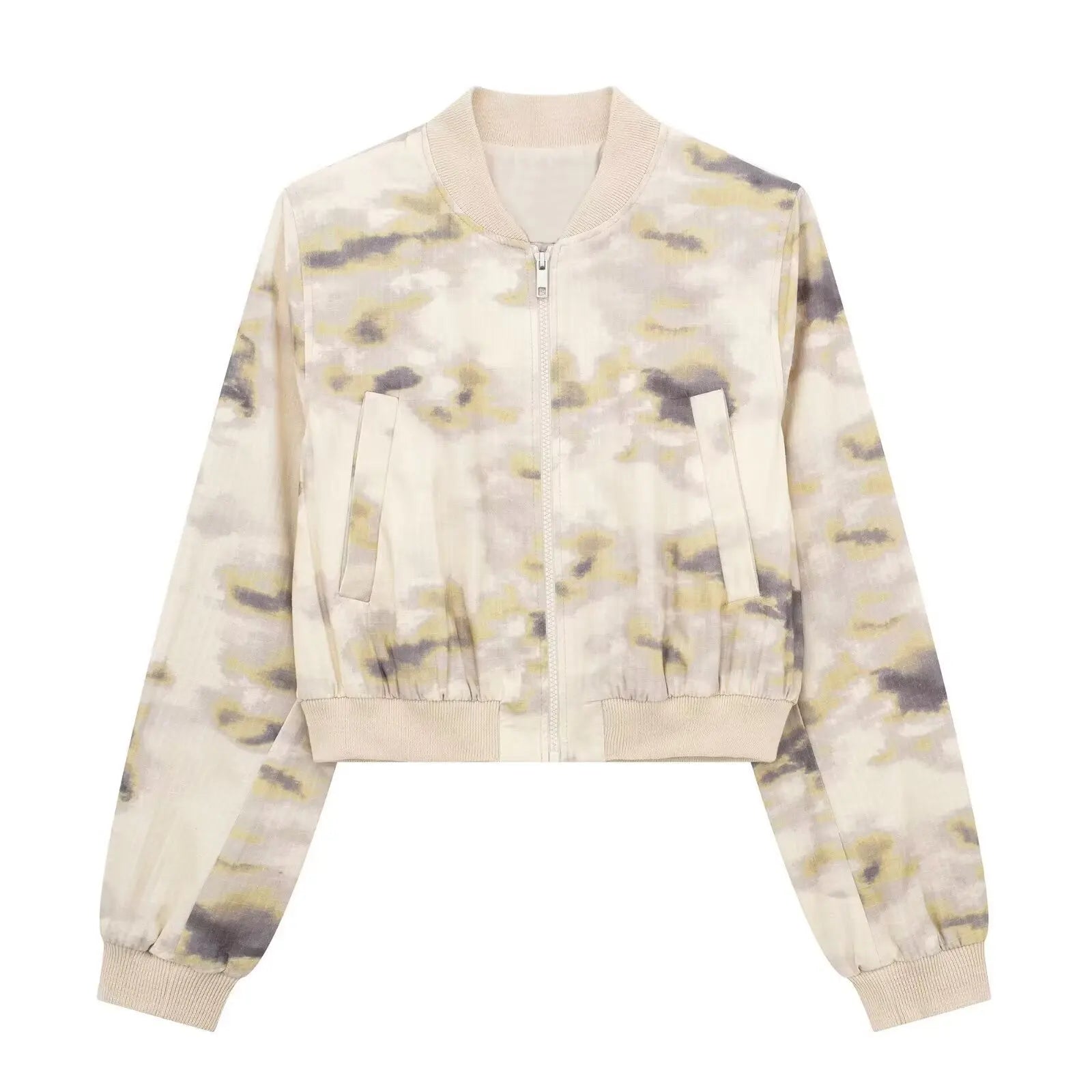 Vintage Print Chic Women Suit O-Neck Zipper Pockets long sleeve jacket for women