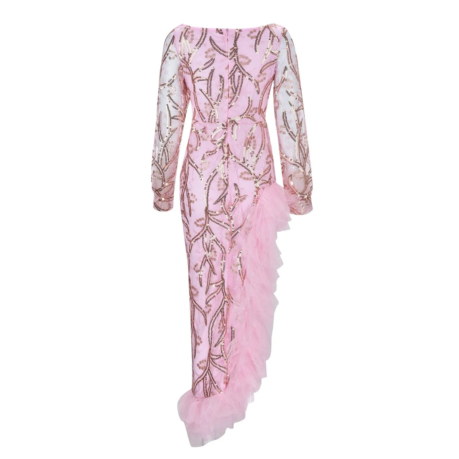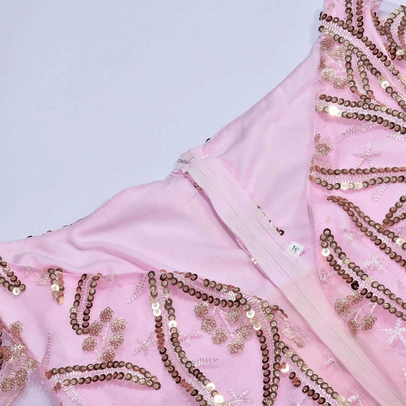 Women's Sexy Mesh Train Sequin Split Pink Evening Gown