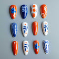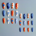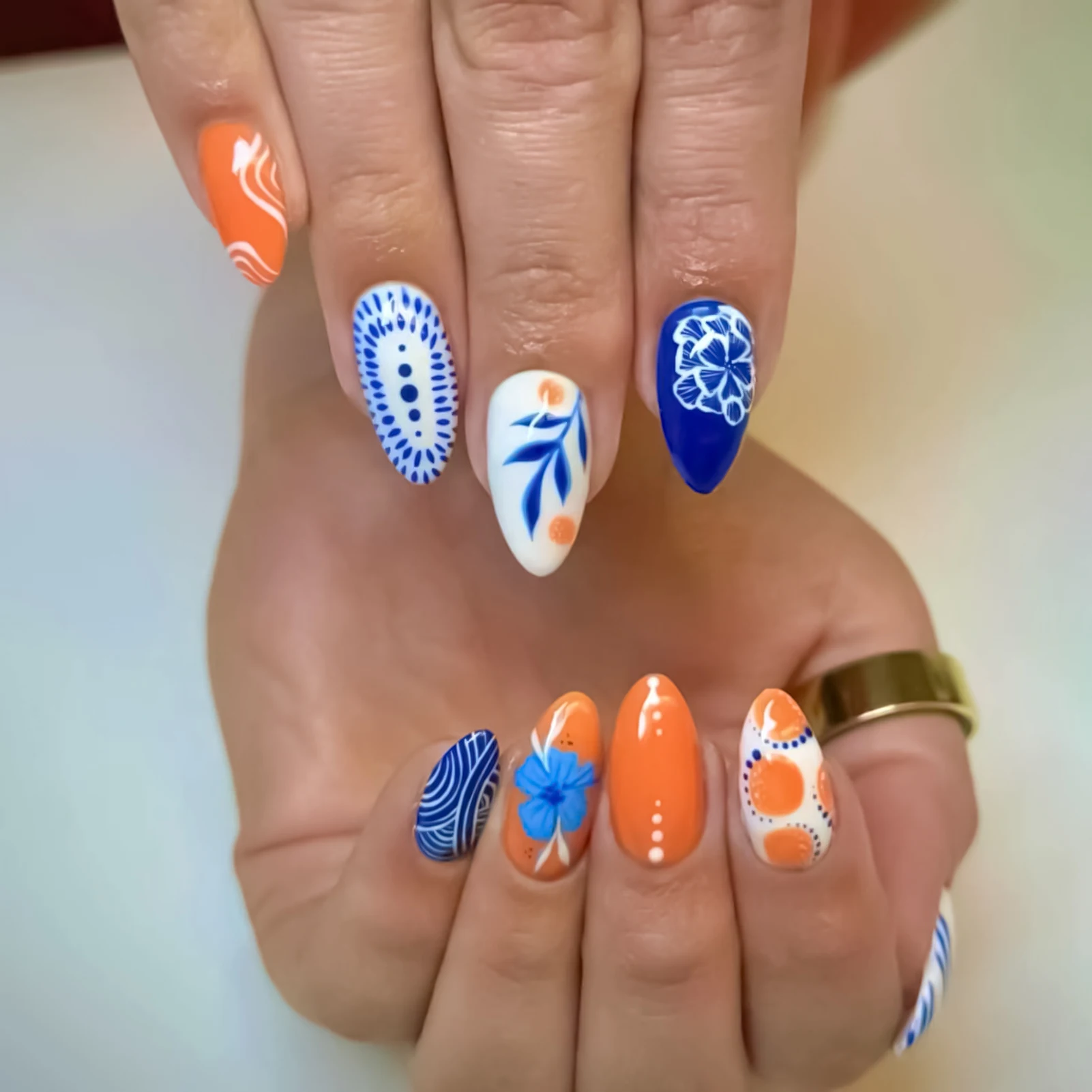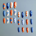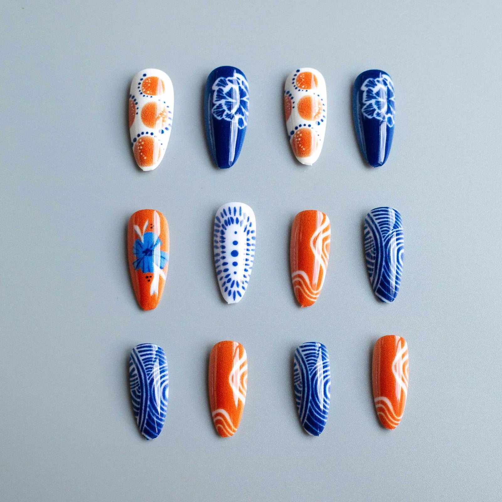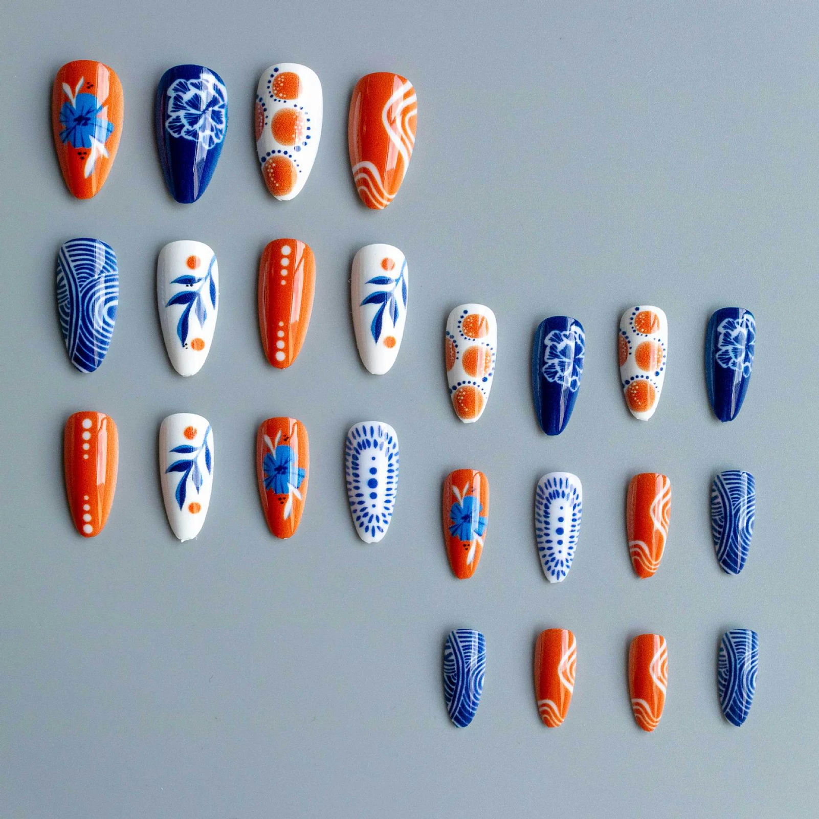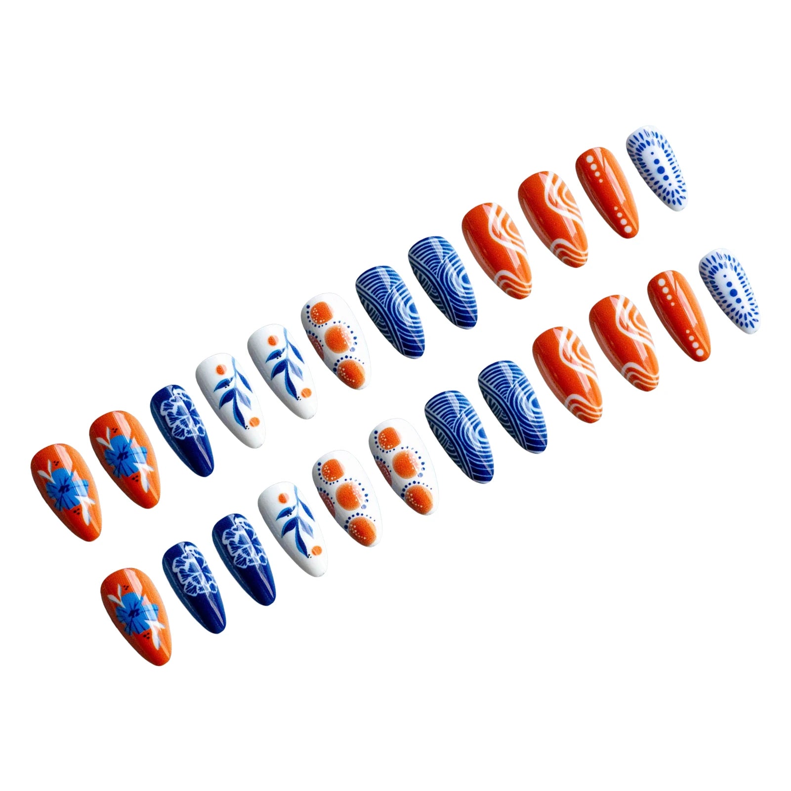 24Pcs Summer Orange Fake Nails with Blue Flowers -Floral Acrylic Full Cover False Nail