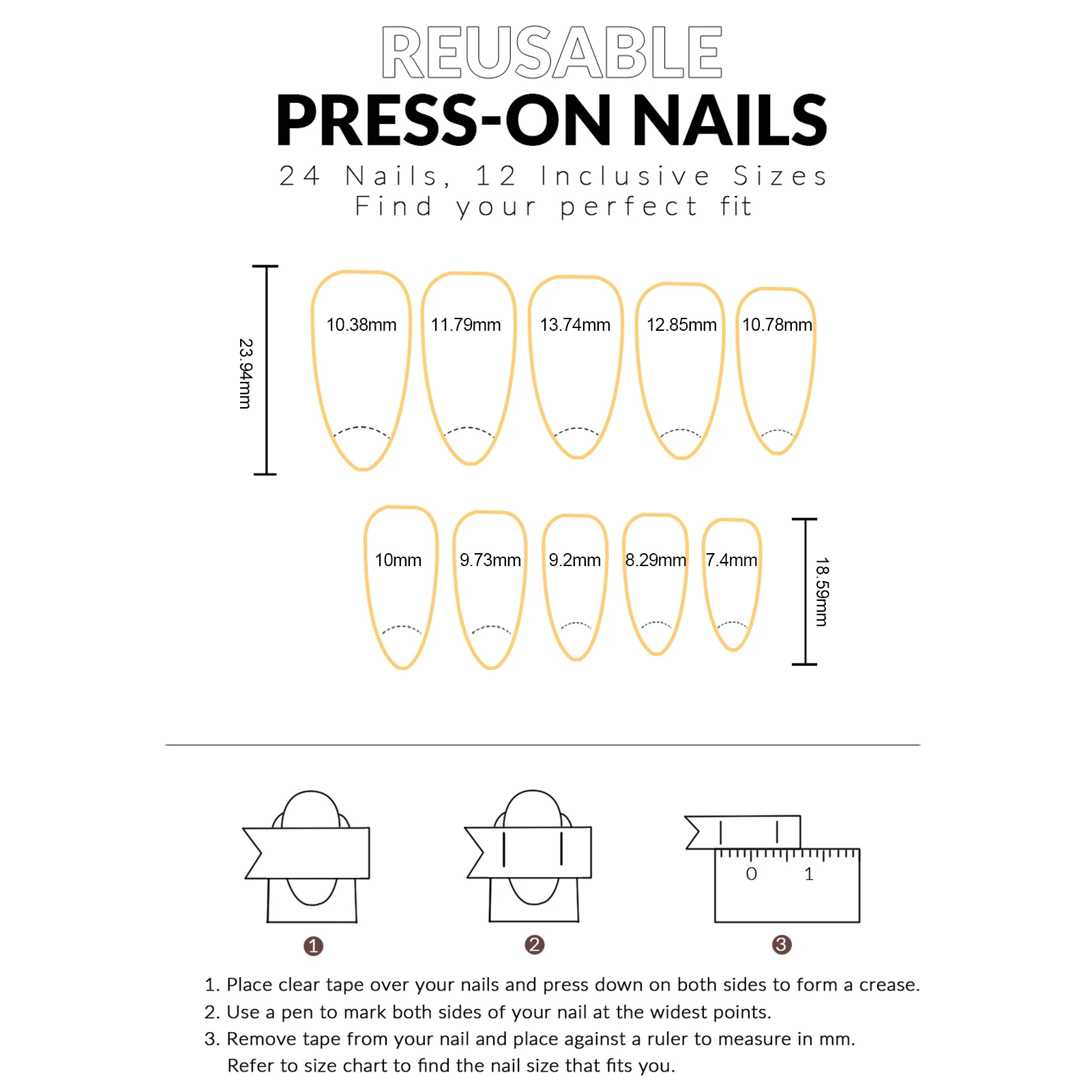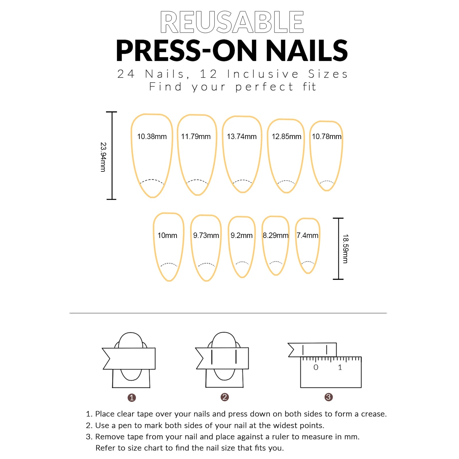 2.Various Sizes: 24 pieces of 12 different sizes of fake nails, no matter what your nail size is, you can choose the most suitable size.  It's easy to trim and file them in any length and shape you like.