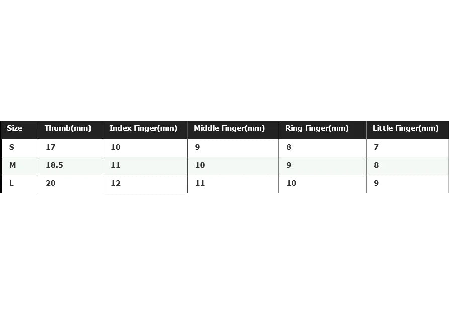Size,Thumb(mm),Index Finger(mm),Middle Finger(mm),Ring Finger(mm),Little Finger(mm)