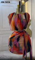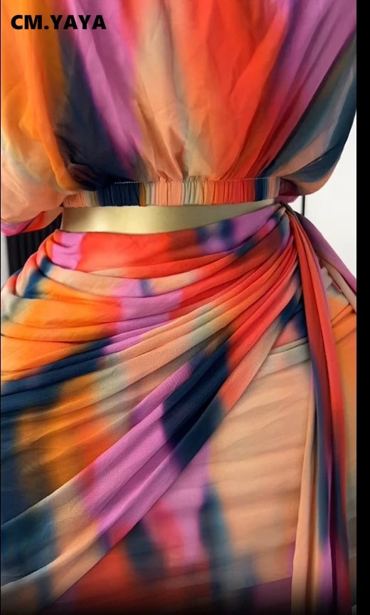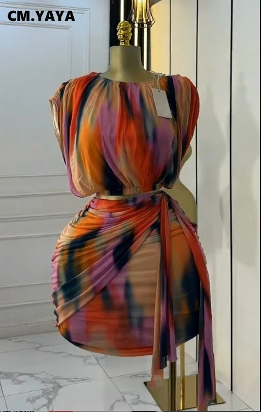 CM.YAYA Tie Dye Printed Women's Set | Ruched Short Sleeve T-Shirt Tops and Stacked Mini Skirts