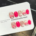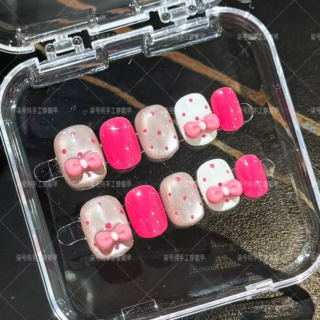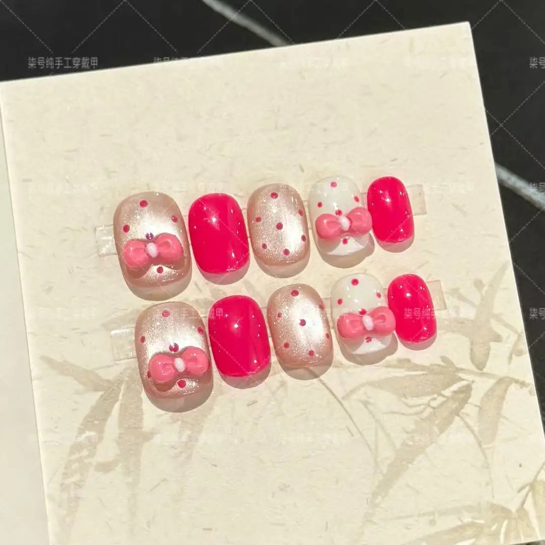 10pcs Handmade Press on Nails Rose Red Polka Dot Glass Bead Cat's Eye Bow Fake Nail for Women&Girl Removable Wearable False Nail