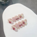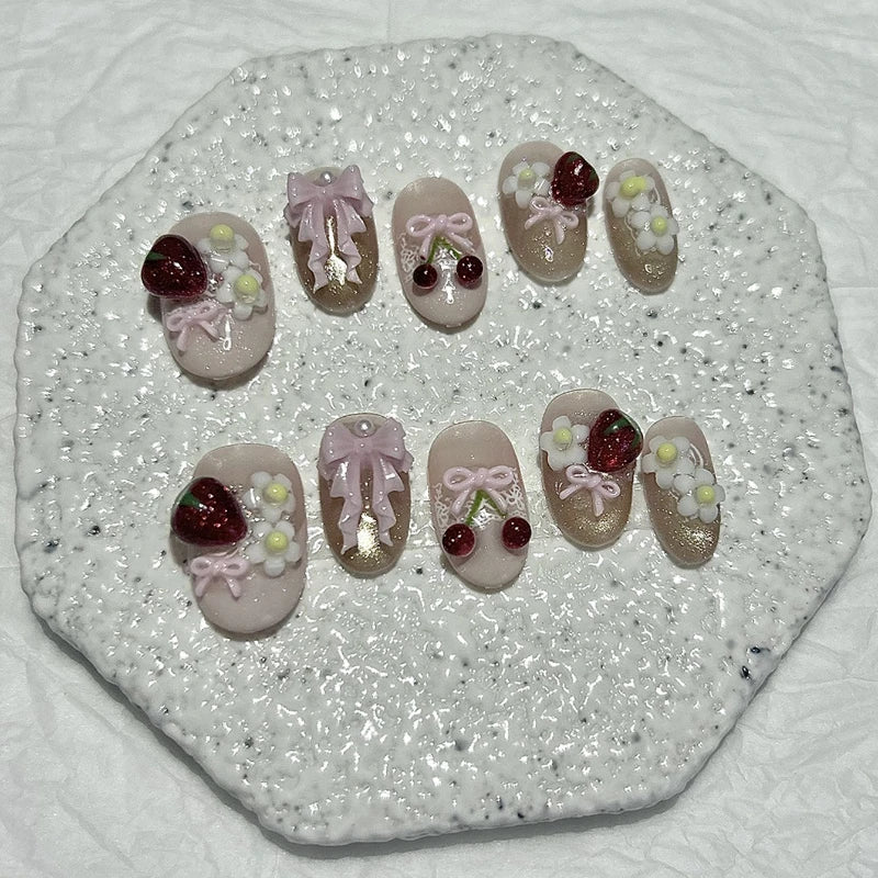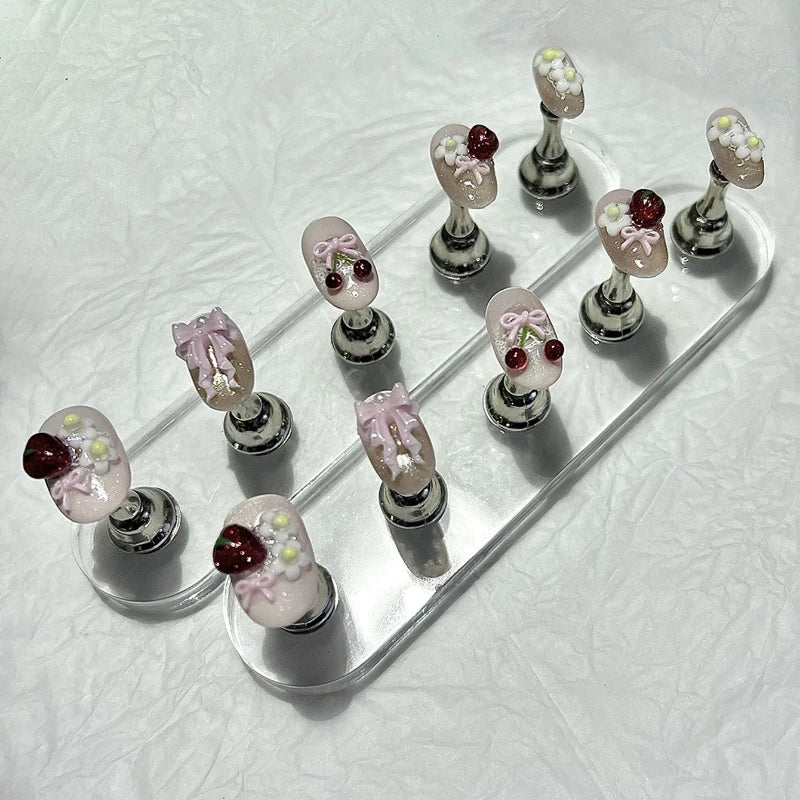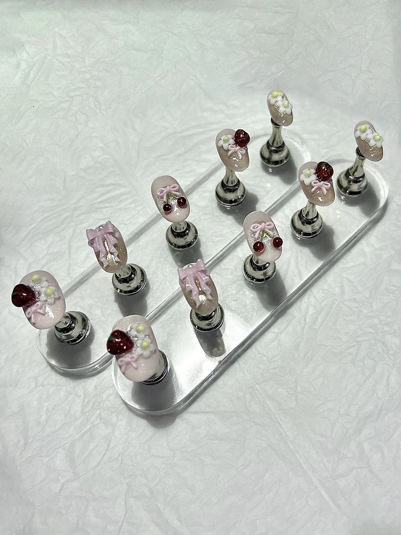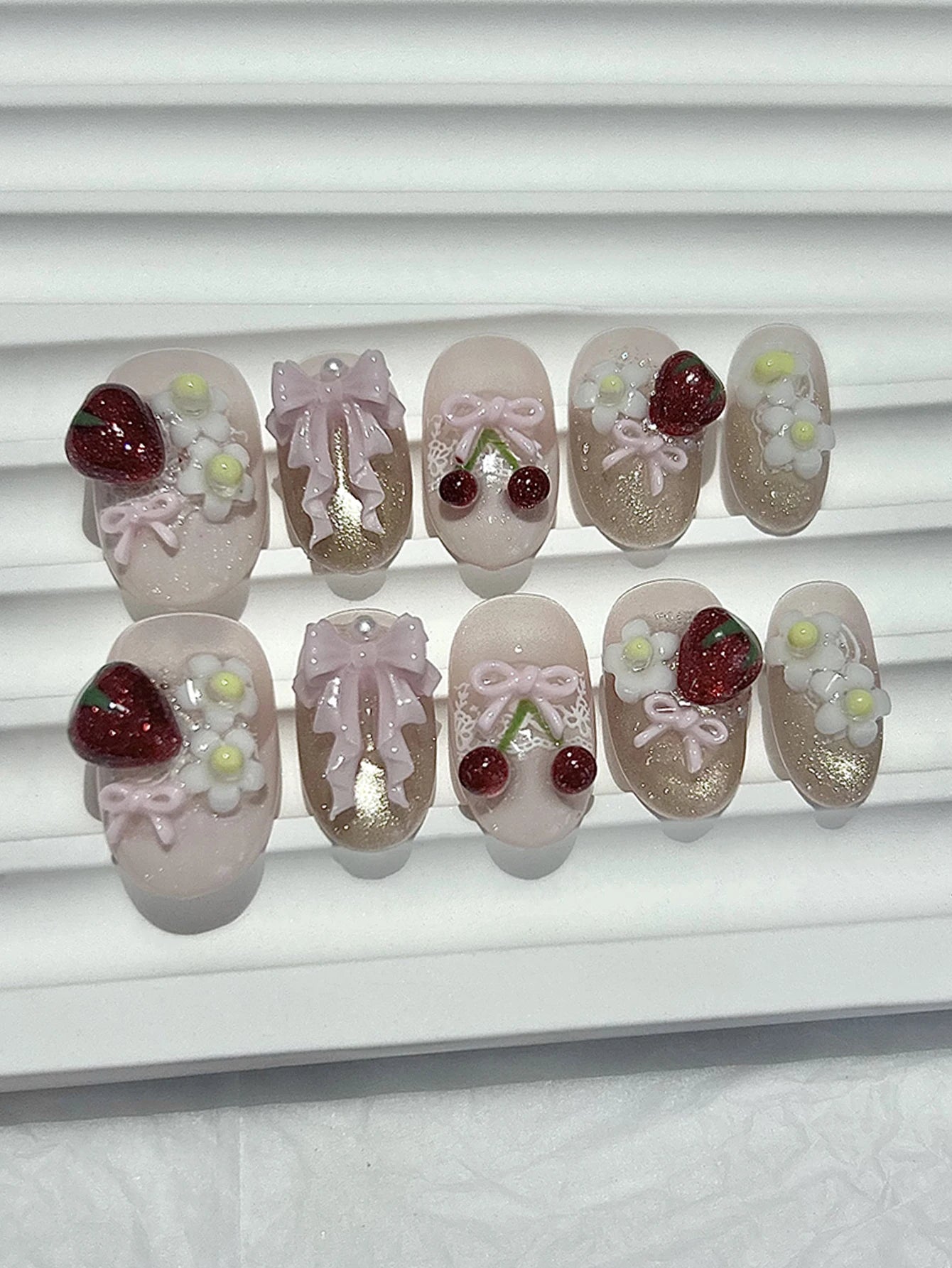10 Pieces Summer Cute Sweet Style Handmade Press On Nails 3D Bow Cherry Strawberry Cat Eye Fake Nails Removable Reusable