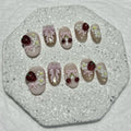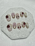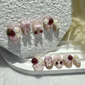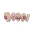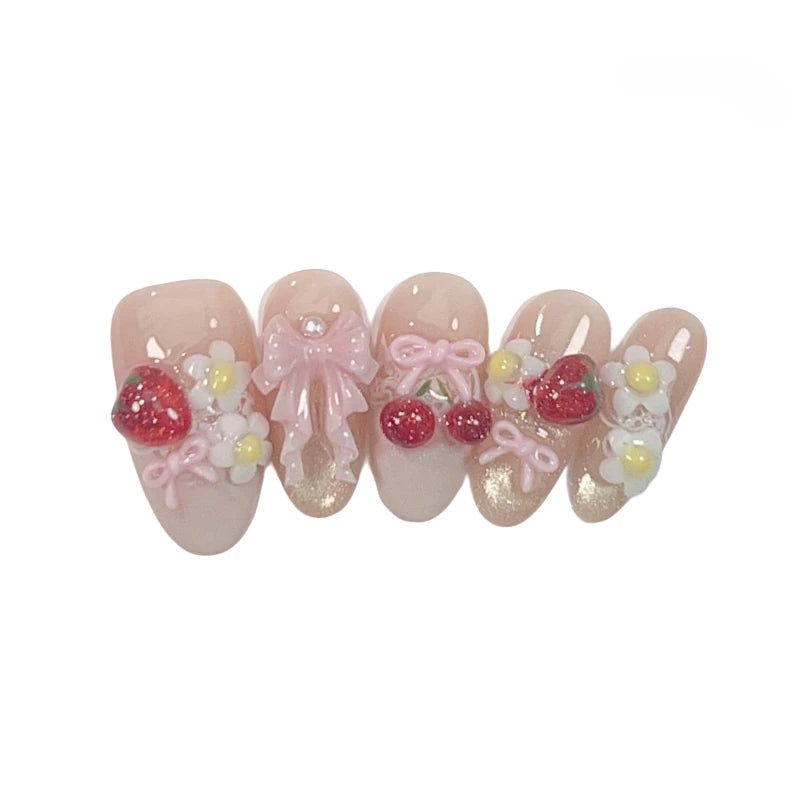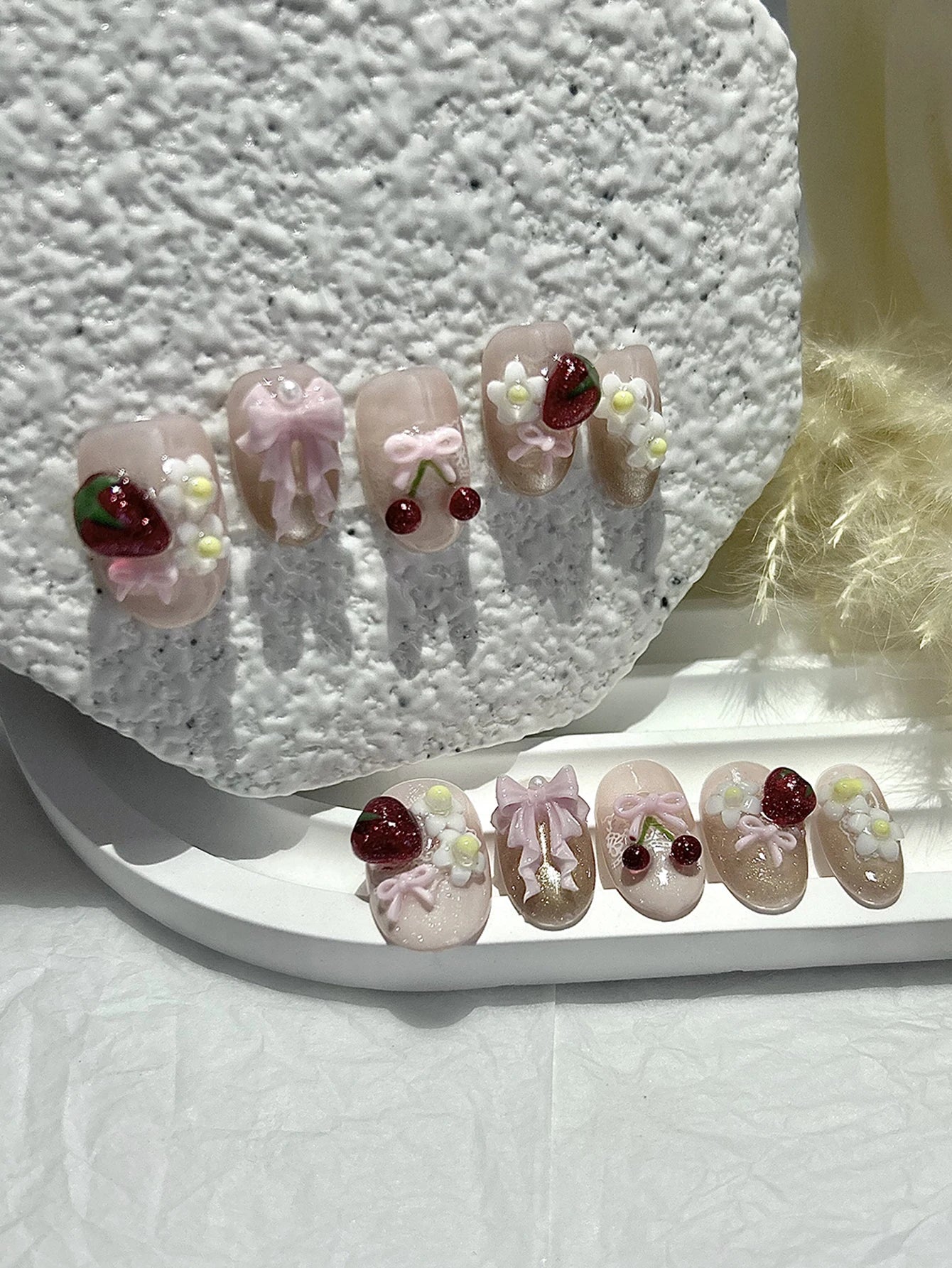 These press on nails are a symphony of sweetness and charm. The nails are bathed in a soft, pale pink hue, creating a gentle and inviting base. Adorable decorations steal the show: Glossy strawberries with glittery finishes seem ready to burst with flavor, while plump cherries add a touch of classic fruit inspired elegance. Delicate white flowers with yellow centers are scattered across, infusing a fresh, natural vibe. Pink bows, some large and flowing, others small and dainty, are artfully placed, adding a whimsical, girly touch. Subtle glitter accents provide a soft shimmer, making these nails perfect for anyone craving a look that's both cute and stylish.