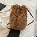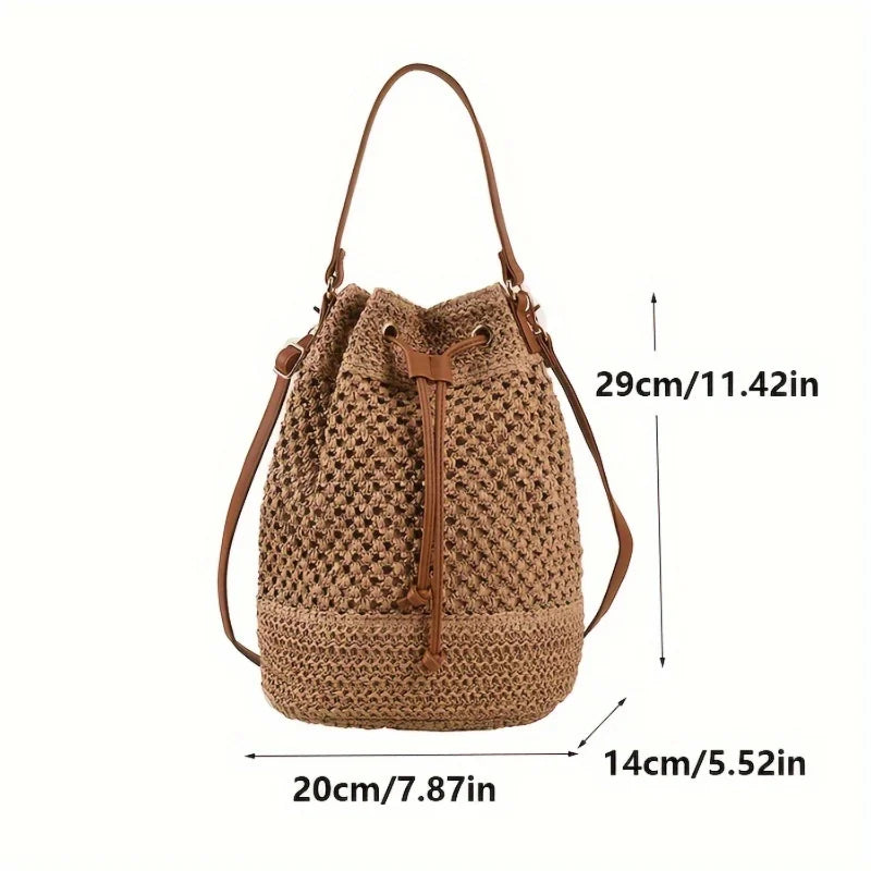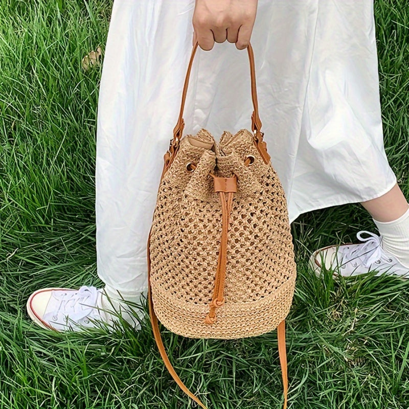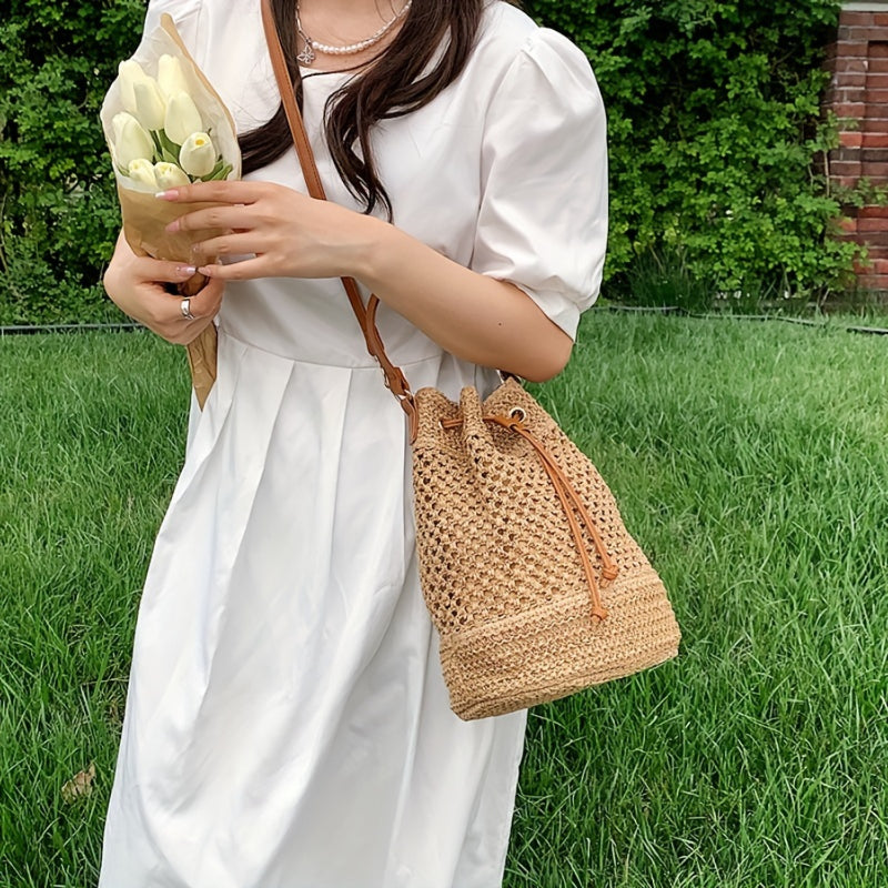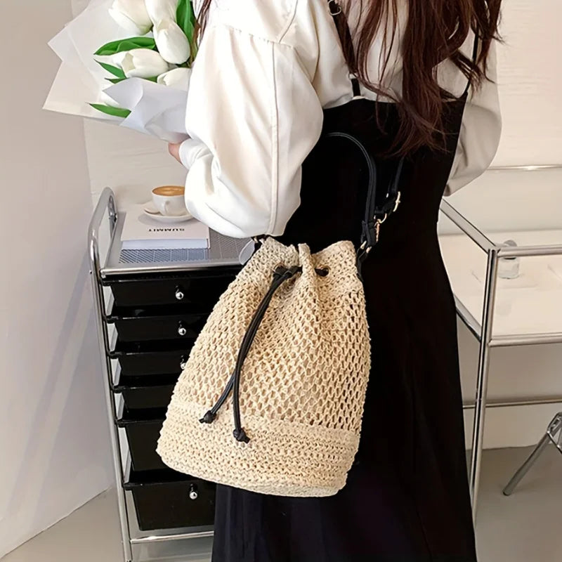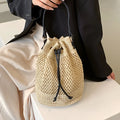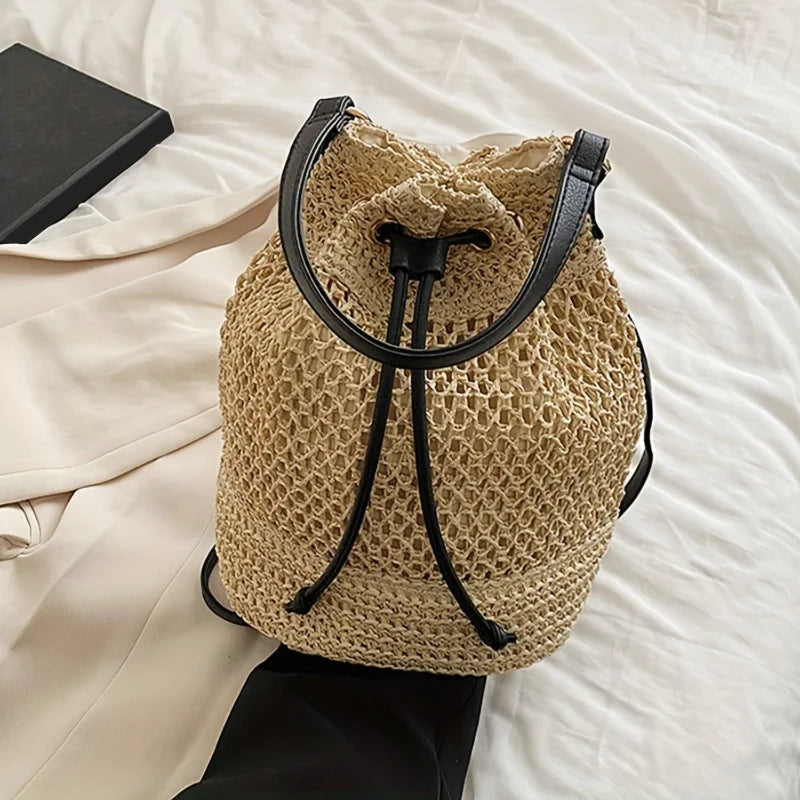 Stylish Minimalist Single Color Bag Design with Summer Straw Design - Chic Beach Drawstring Satchel for Women