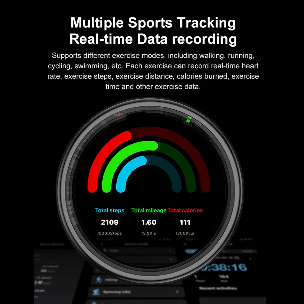 1. Comprehensive Activity Tracking: The smart ring is your health manager, tracking daily activities like steps, distance, and calories. Stay on top of your fitness goals effortlessly with this heart rate blood oxygen monitor ring.