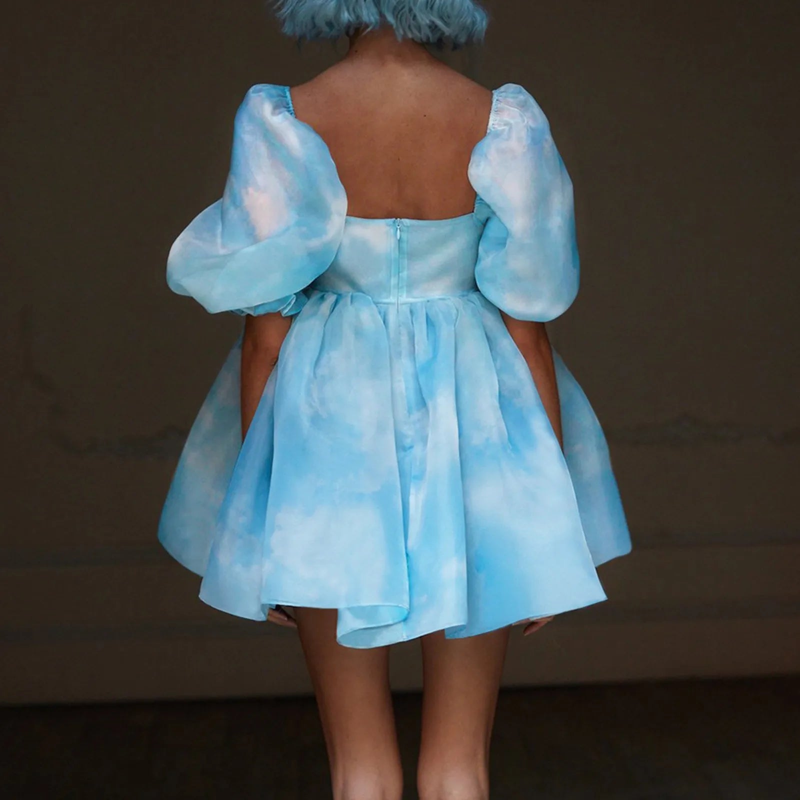 • Short sleeve,High waist, Puff sleeve, Back zipper
